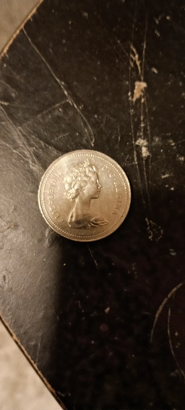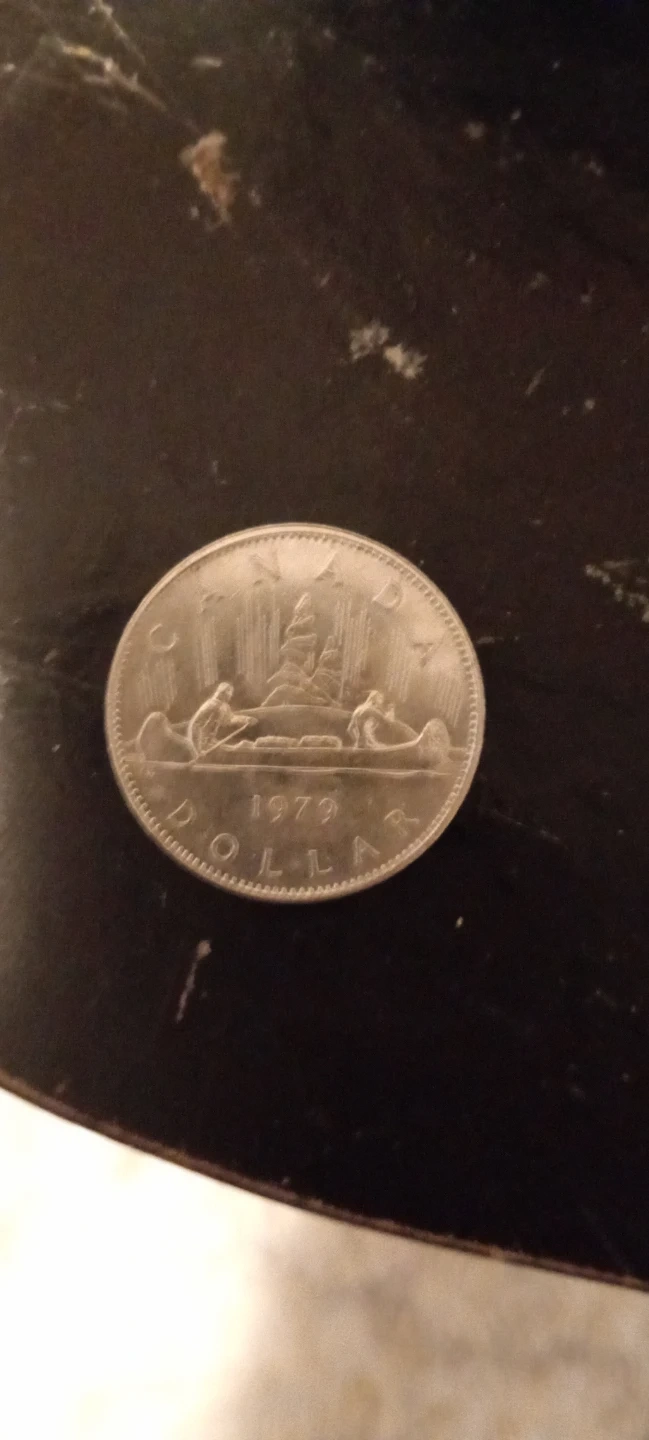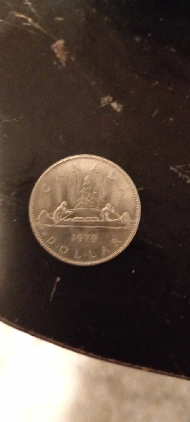 Canadian one dollar coin from 1979. Features Queen Elizabeth II on the obverse and a canoe scene on the reverse. It's a unique piece of Canadian currency.