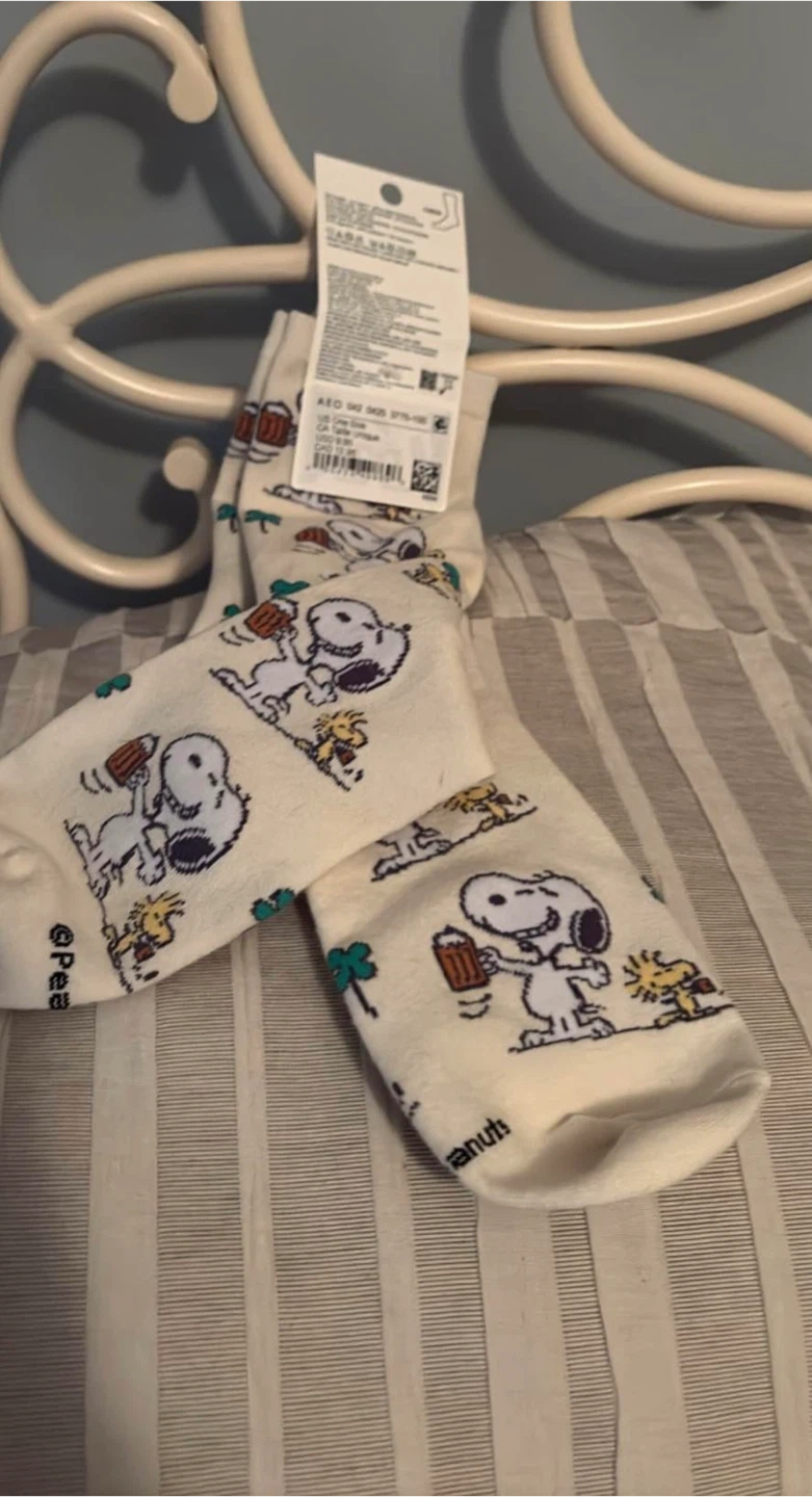 Cream coloured crew socks featuring Snoopy and Woodstock graphics. These socks are a one-size fit. They're made from a comfortable fabric blend.