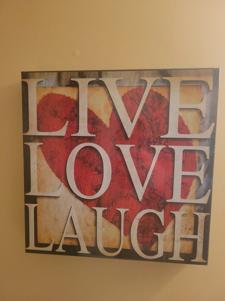 Square metal wall art. Features a large red heart and the words Live Love Laugh. Perfect for adding a touch of warmth to your home.