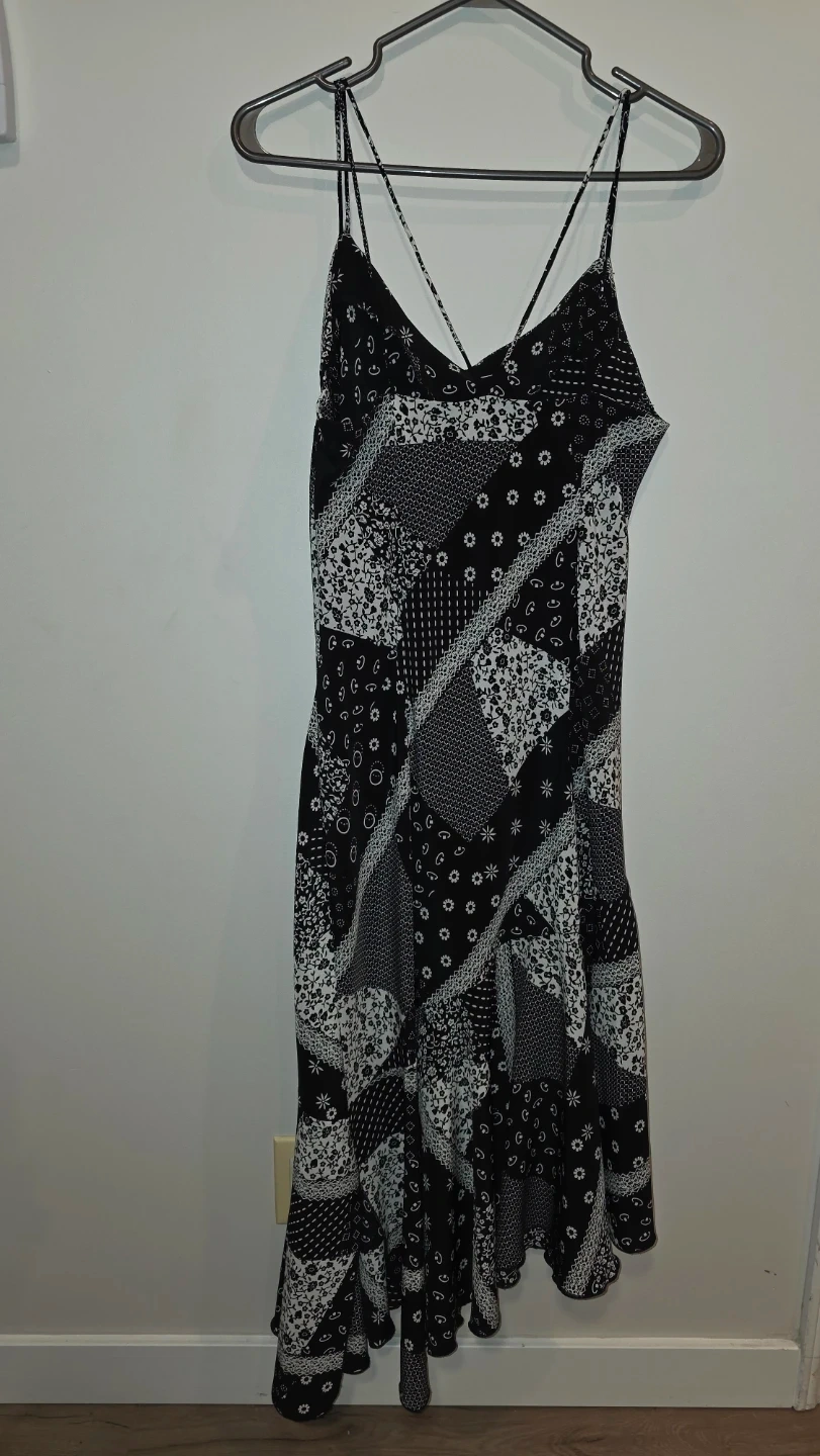 This Jessica spaghetti strap dress features a unique black and white patchwork print. It has a flattering V-neck , criss-cross straps. The asymmetrical hemline adds a stylish flair.