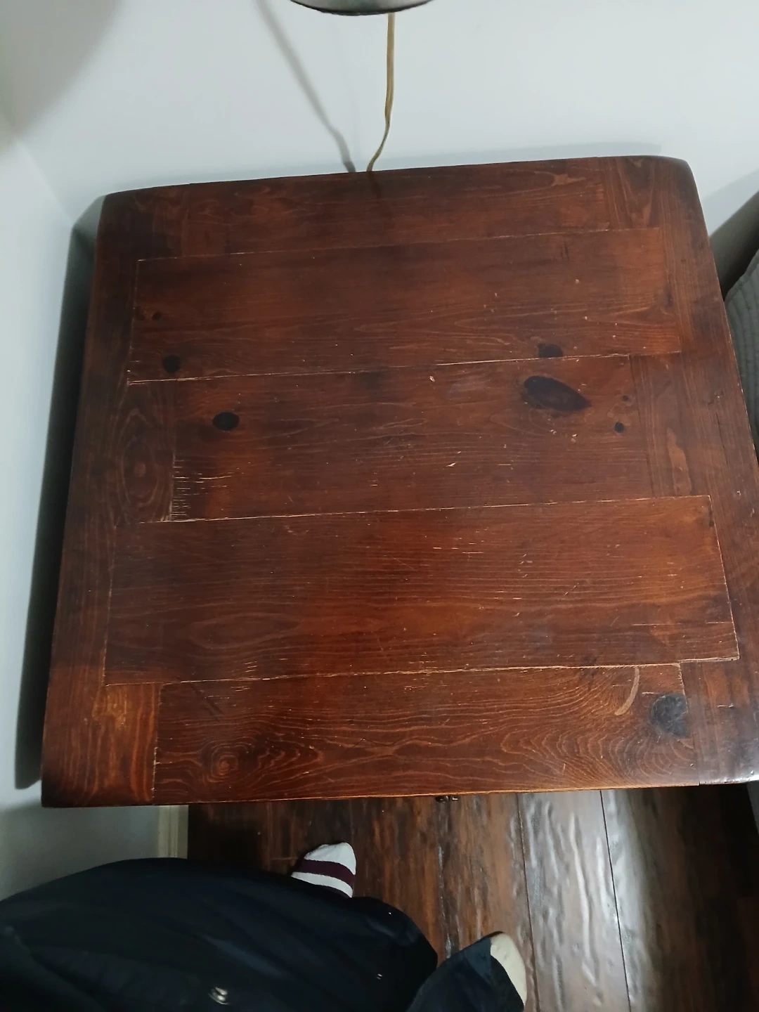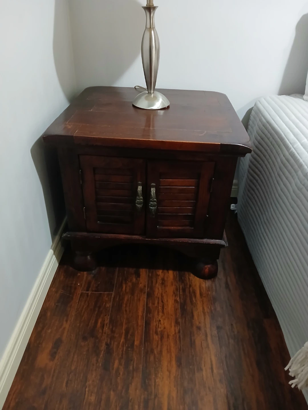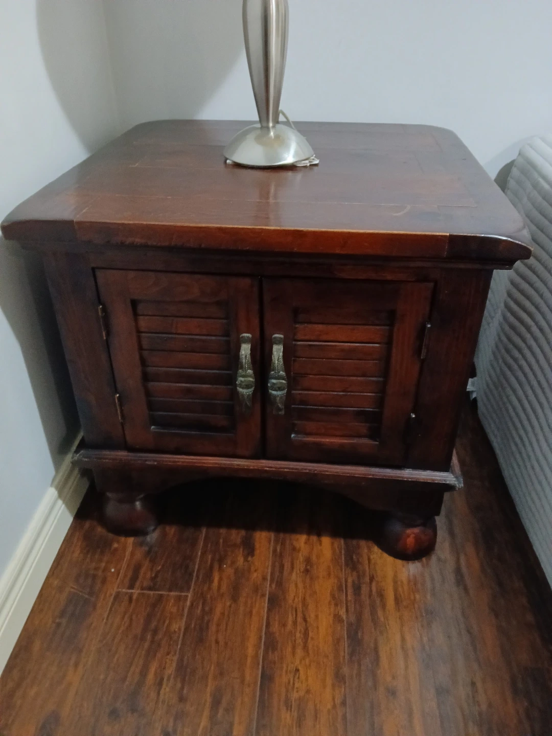 Great quality wooden vintage side or end table. 2 feet by 2 feet. Two little doors open to a pretty large interior storage space. Can store anything here -- video games, movies, books, etc