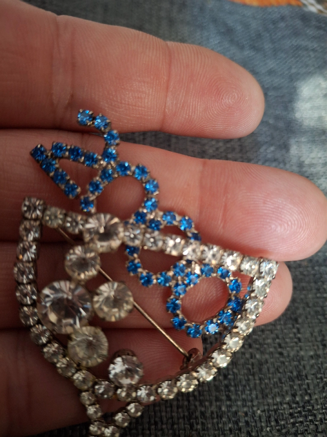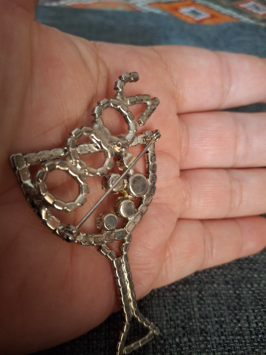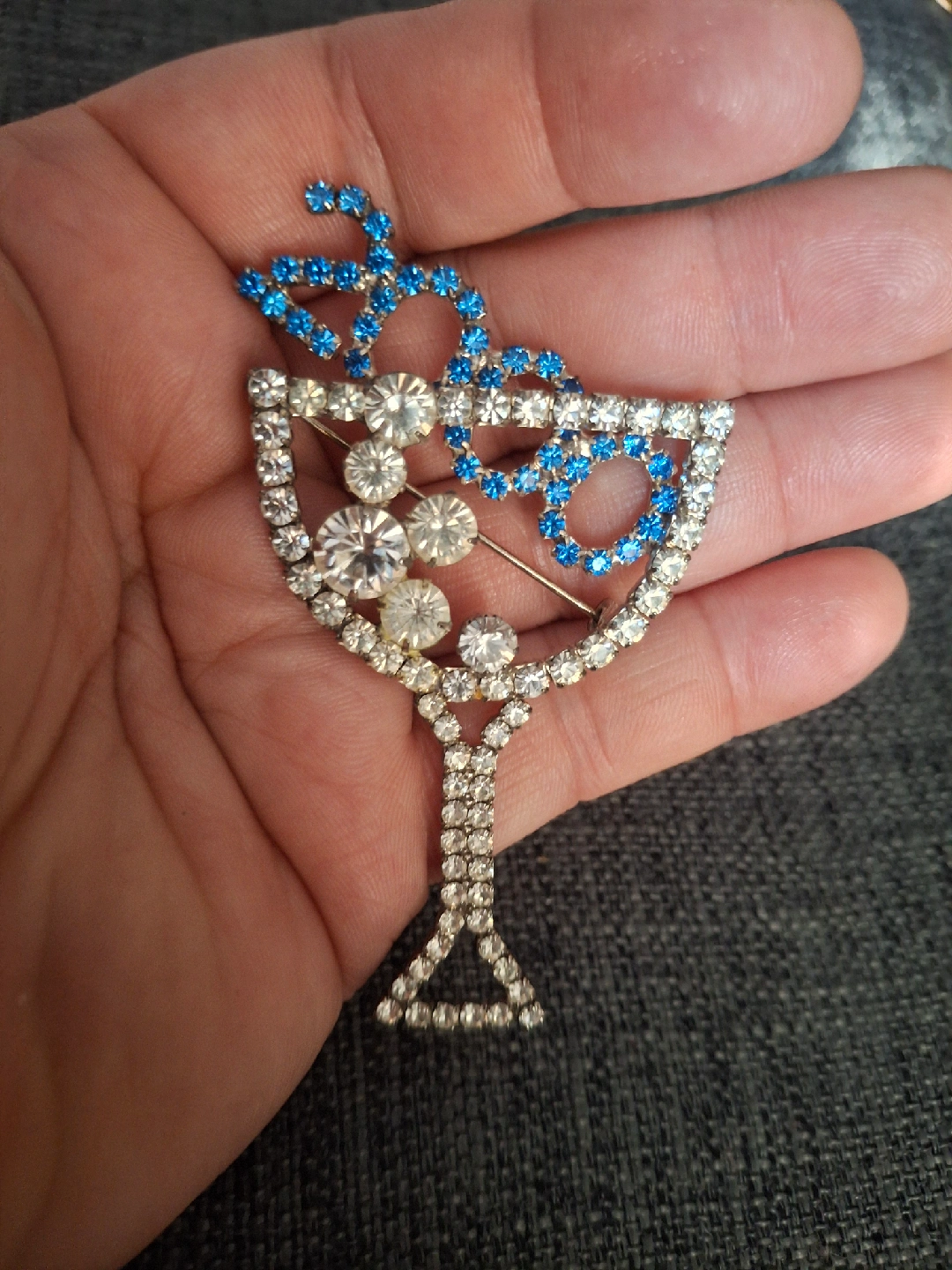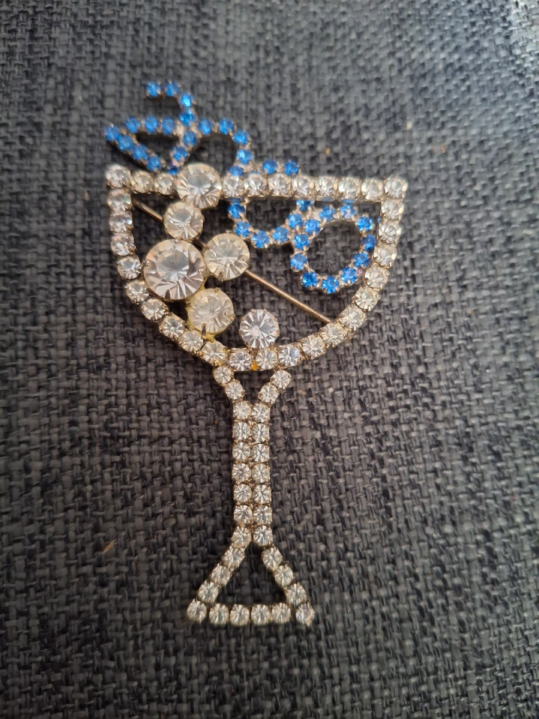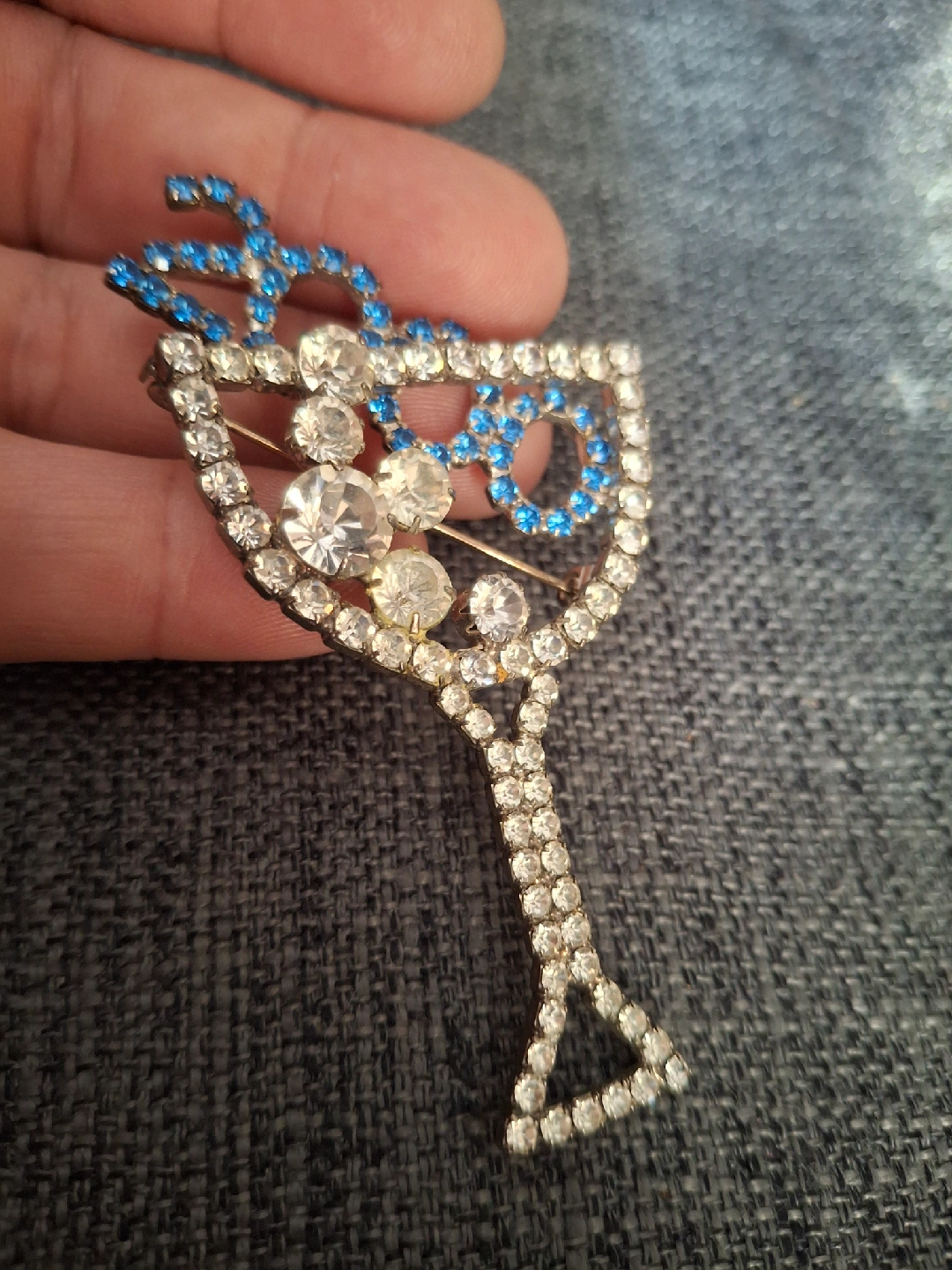 This is a cute brooch in the shape of a cocktail glass! It features clear and blue rhinestones. It's perfect for adding a bit of sparkle to your outfit or accessories