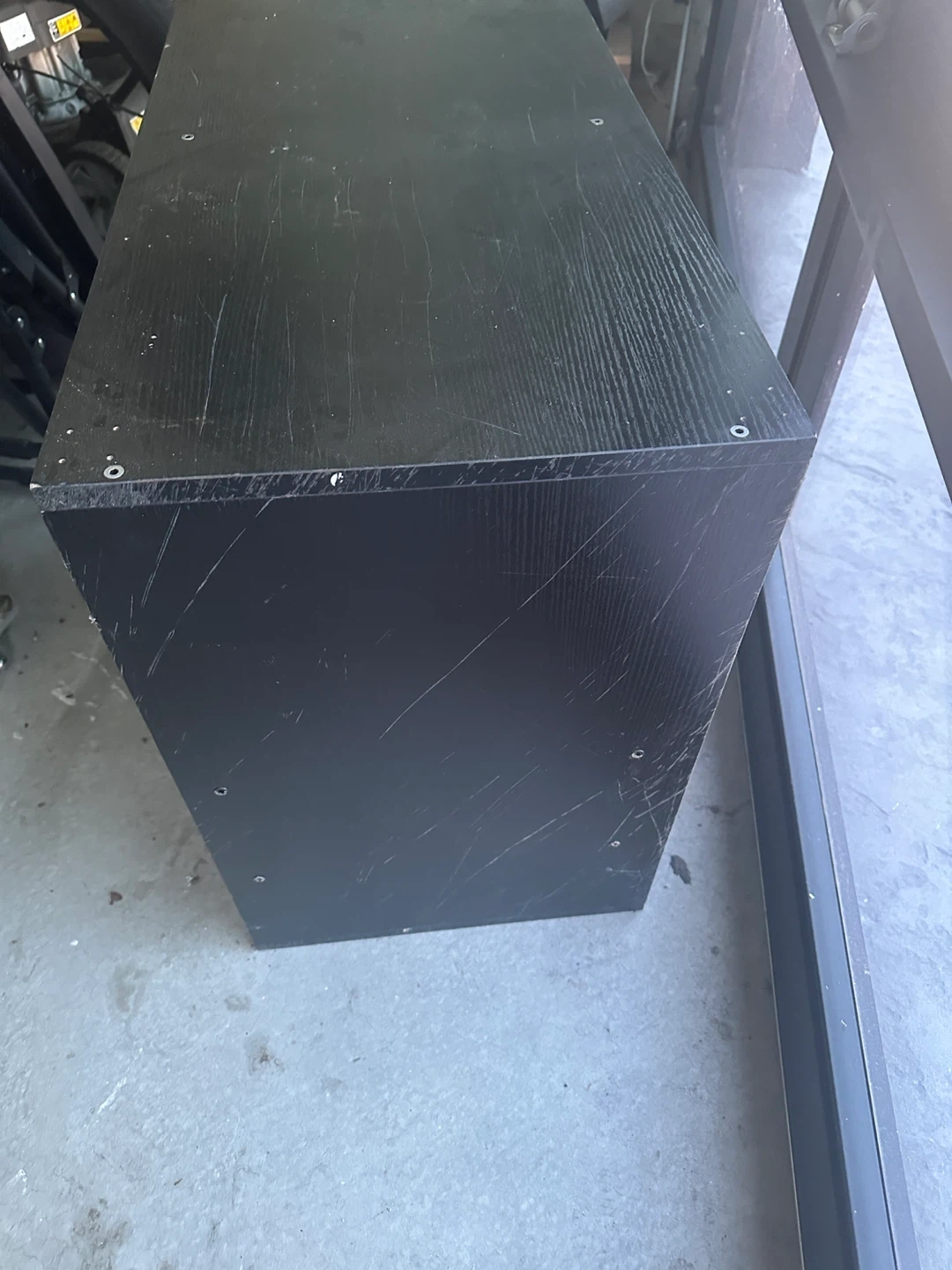 Selling a black TV stand or media console. It has a few shelves and a drawer for storage. There are some scratches on the top and sides, as shown in the pictures, but it's still functional and sturdy. Perfect for a living room or entertainment area