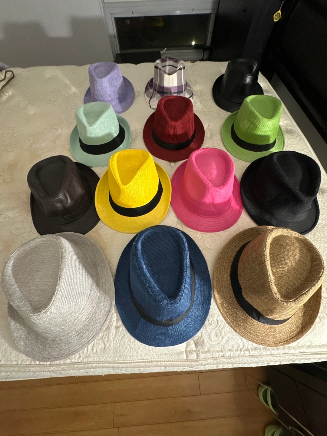 Selling a variety of fedora hats in different colours. They are in great condition and ready for a new home! 15$ each or take all 13 for 135$