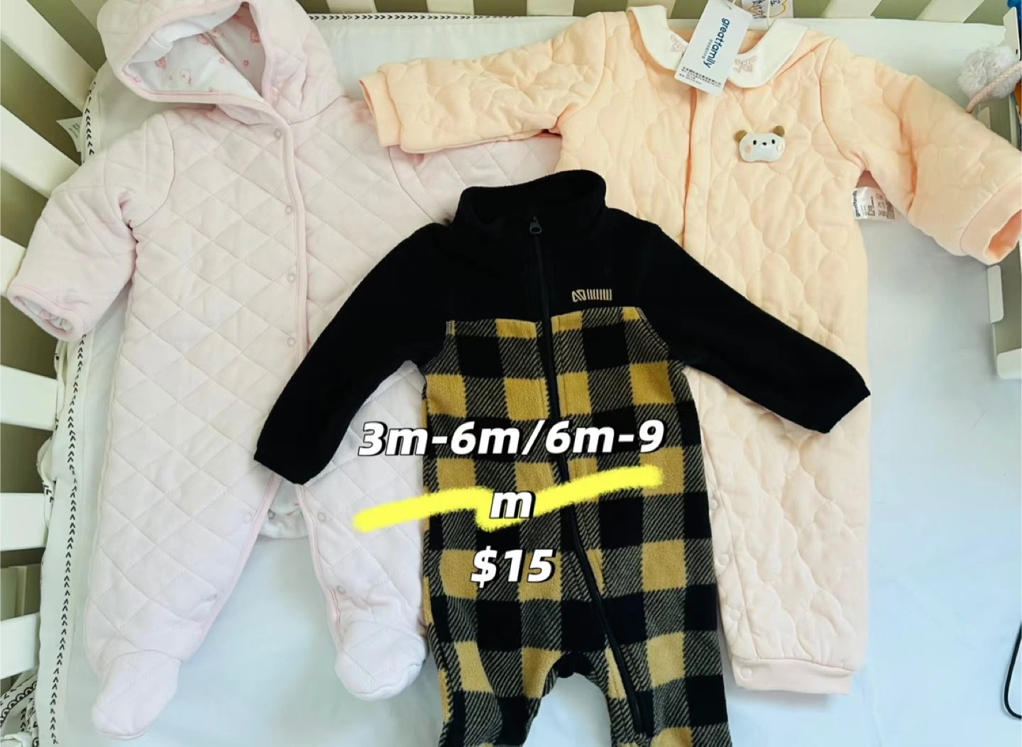 Selling these cute baby onesies! The pink one and the peach coloured one are quilted, and the black and yellow one is a fleece onesie. Sizes range from 3-6 months and 6-9 months