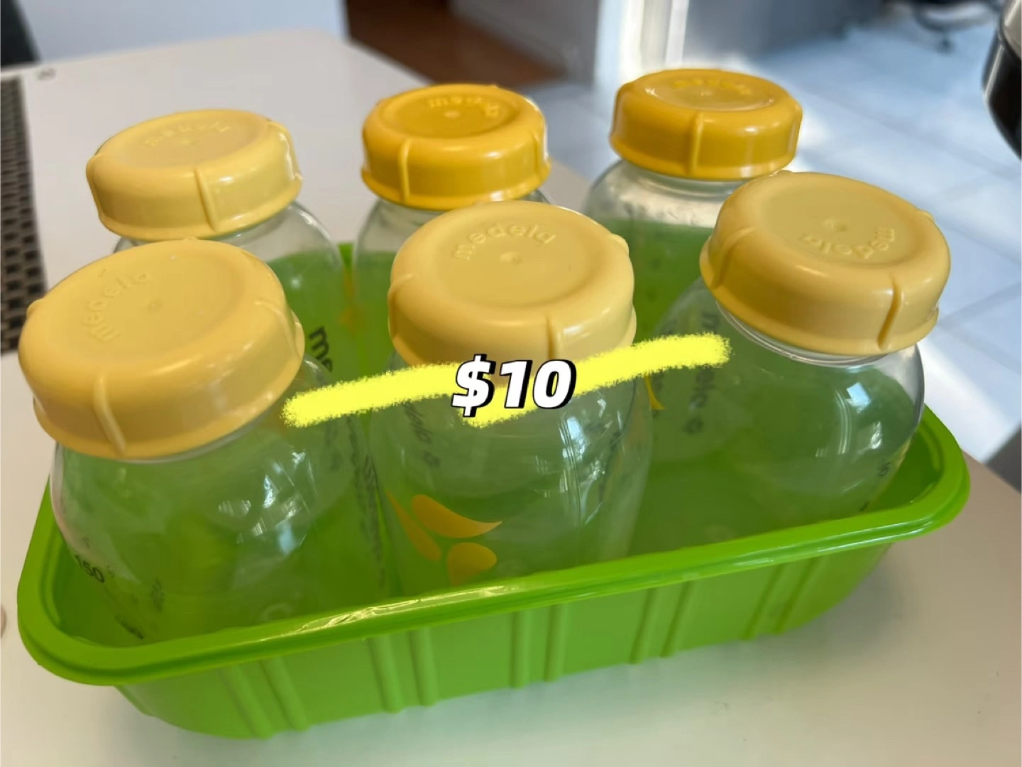 Selling a set of six Medela breast milk storage bottles, each 5 oz in size. They come with yellow lids and a green tray for easy storage. Perfect for storing breast milk safely and conveniently!