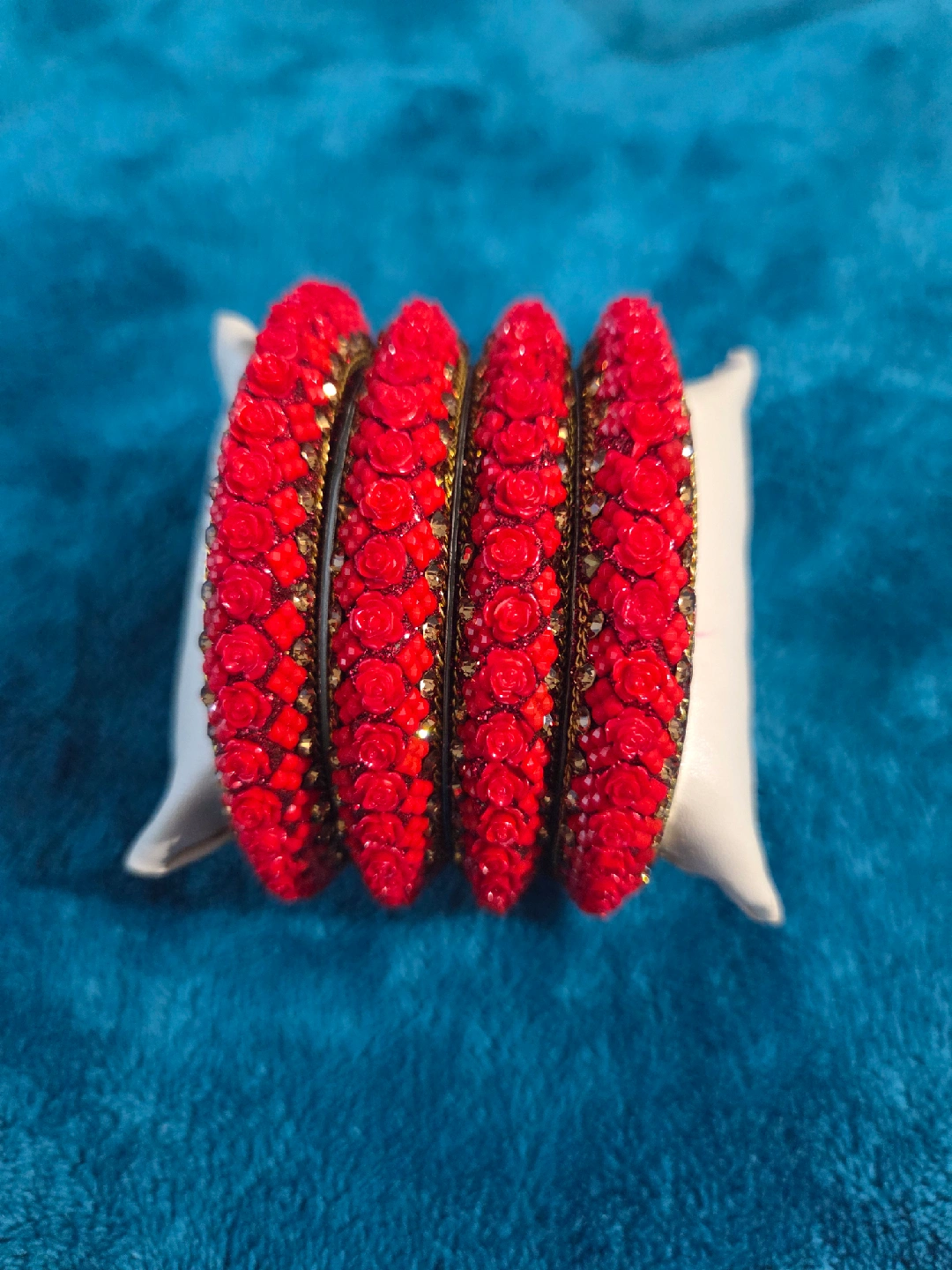 Beautiful set of red rose bangles! These are perfect for adding a pop of colour to any outfit. They feature intricate rose detailing and gold accents