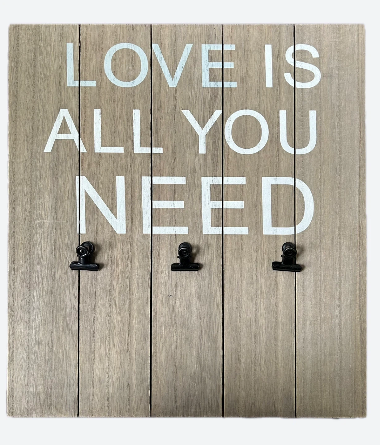 This lovely wooden wall decor piece features the phrase "Love Is All You Need" in white and grey lettering. It has a rustic, charming look and is perfect for adding a touch of warmth to any room. It also has three clips at the bottom to hold photos or notes.