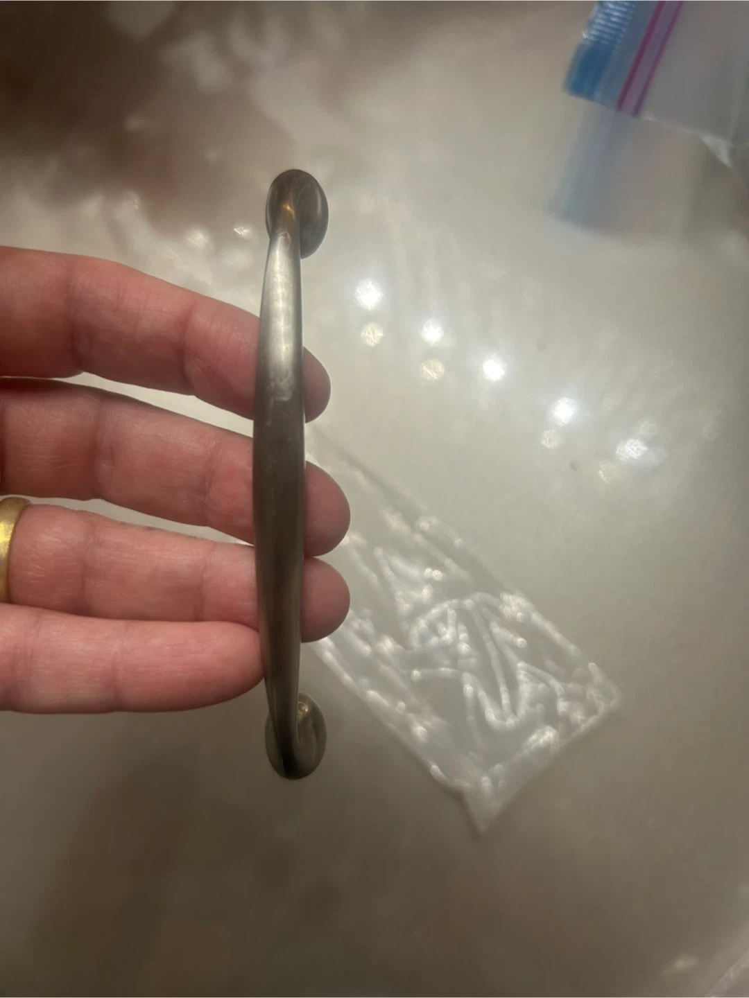 I have a set of cabinet or drawer pulls still in their original packaging. They appear to be a brushed metal finish. Great for updating your kitchen or bathroom!