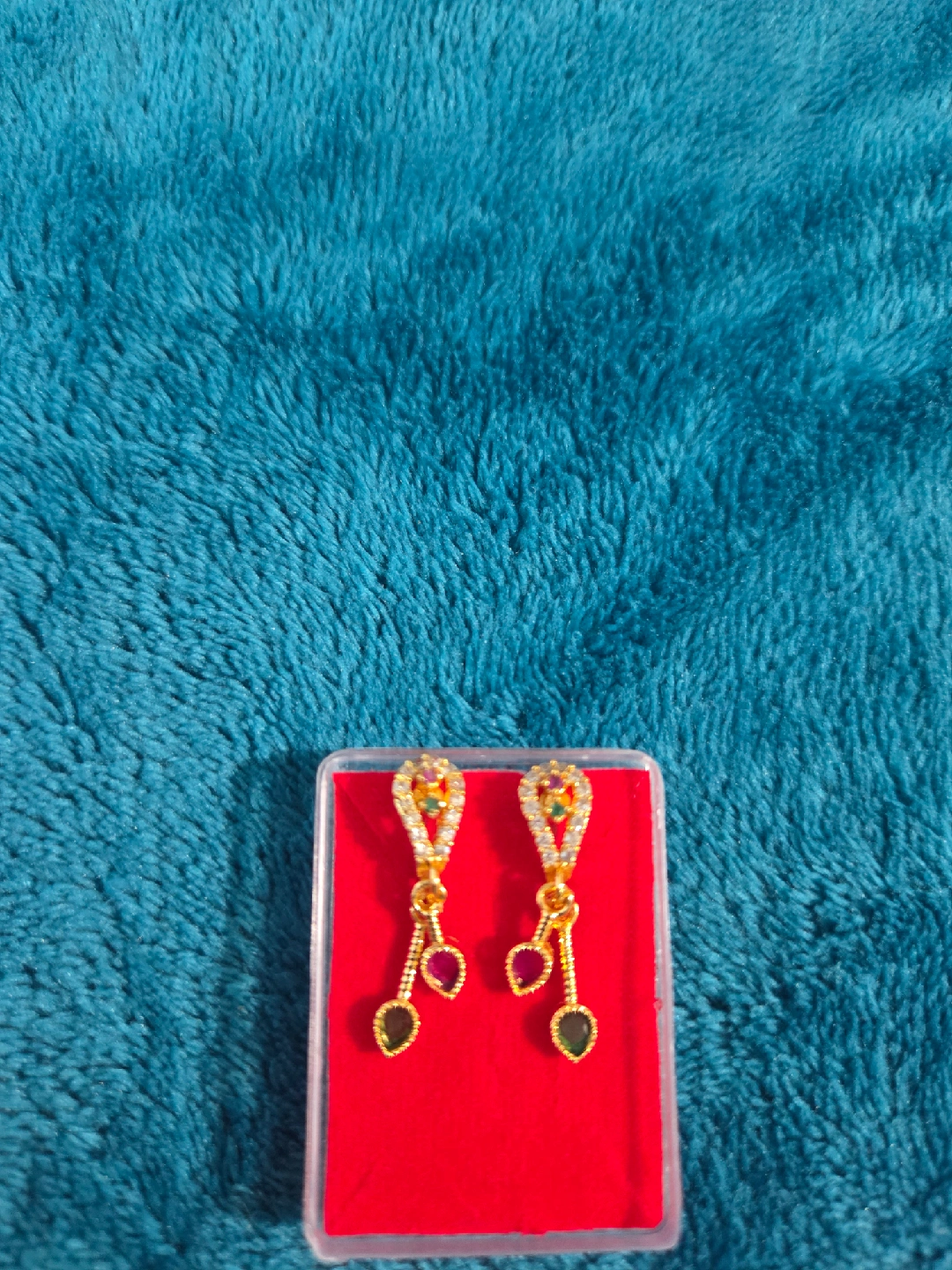 These are a pair of gold tone dangle earrings. They are in a red and clear box. They have small red and green stones.