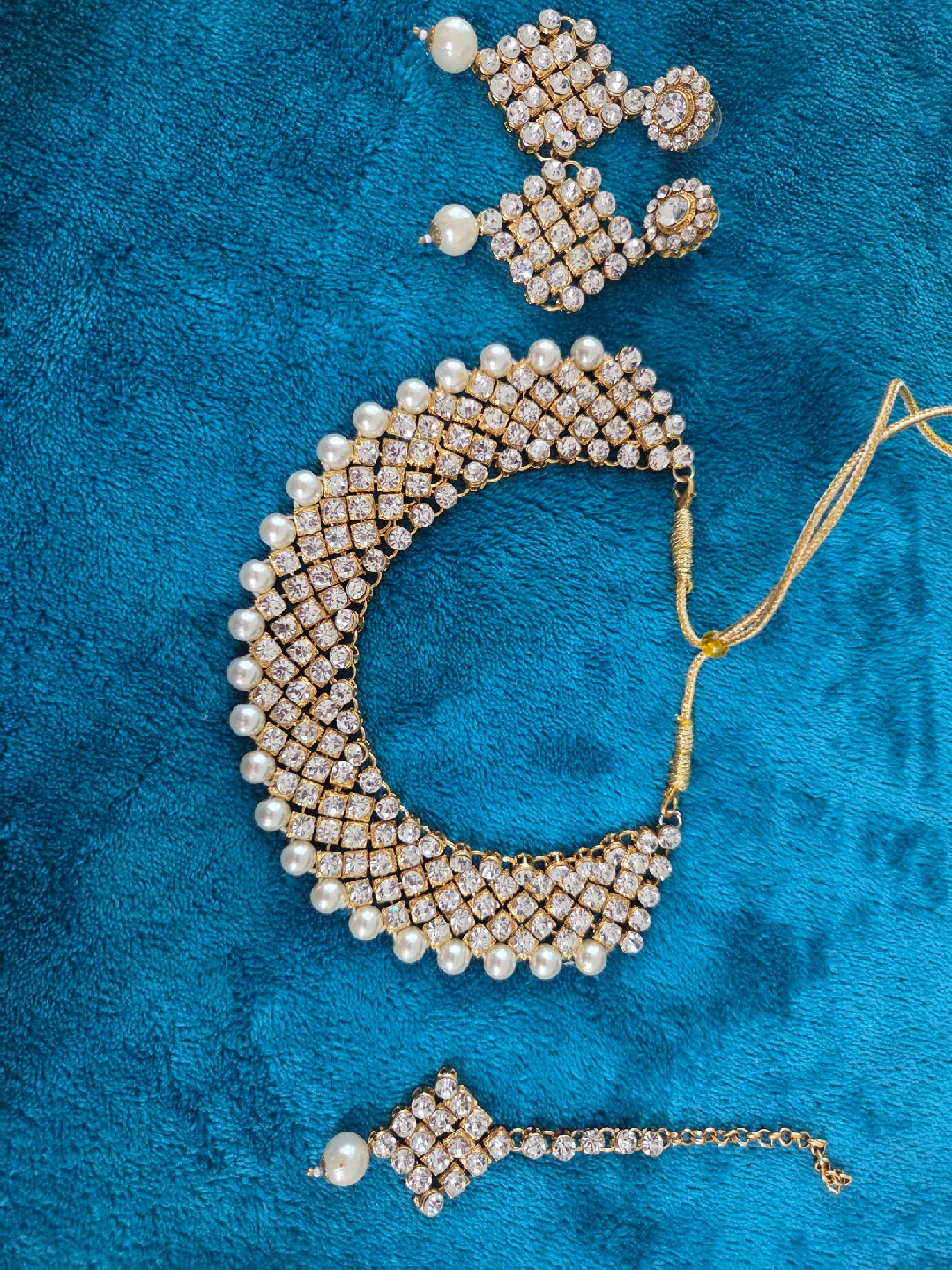 Selling a beautiful jewellery set which includes a necklace, a pair of earrings, and a tikka. This set features a gold-tone base adorned with sparkling stones and faux pearls. Perfect for adding a touch of elegance to any special occasion!