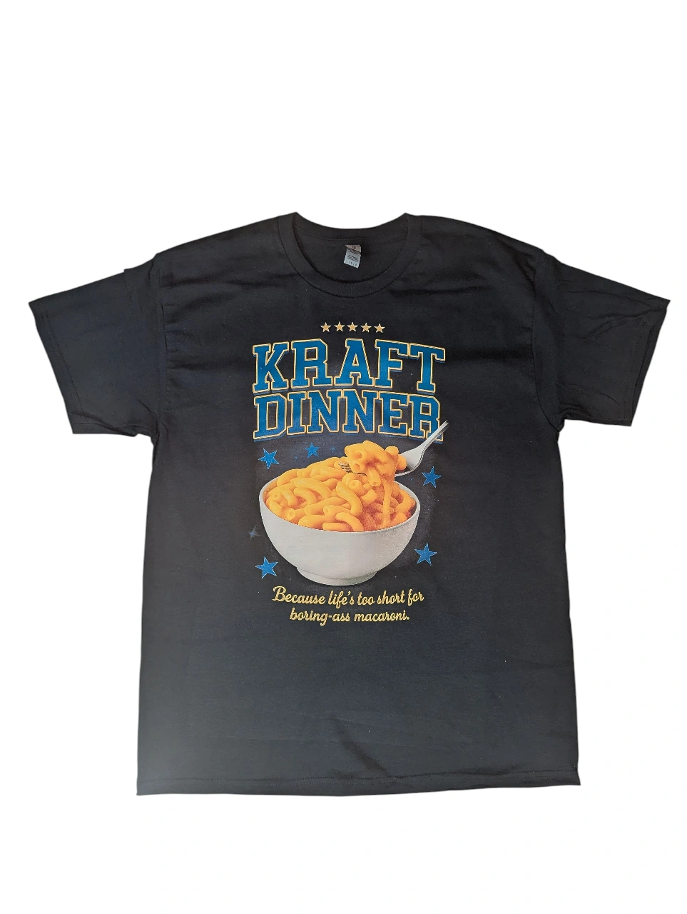 Because Life’s too short for boring-ass macaroni T-shirt. This large black Kraft Dinner tee is the ultimate tribute to Canada’s favorite comfort food. Featuring a bold mac & cheese graphic and cheeky slogan, it’s perfect for snack lovers, nostalgia seekers, and anyone who takes their KD seriously.