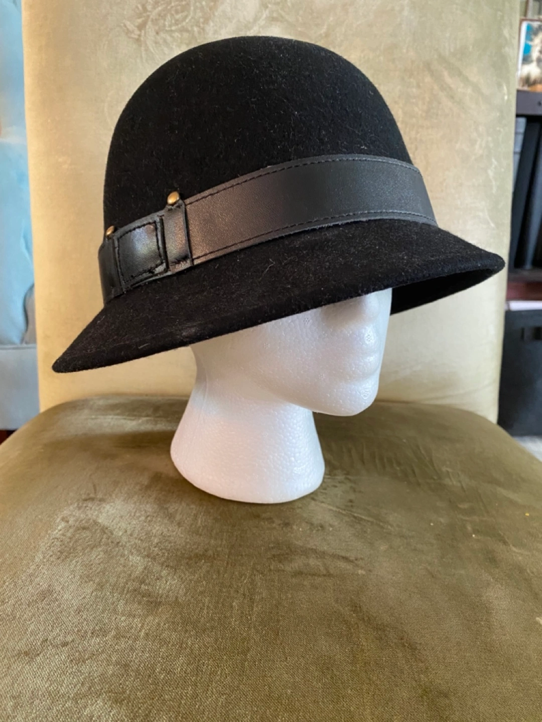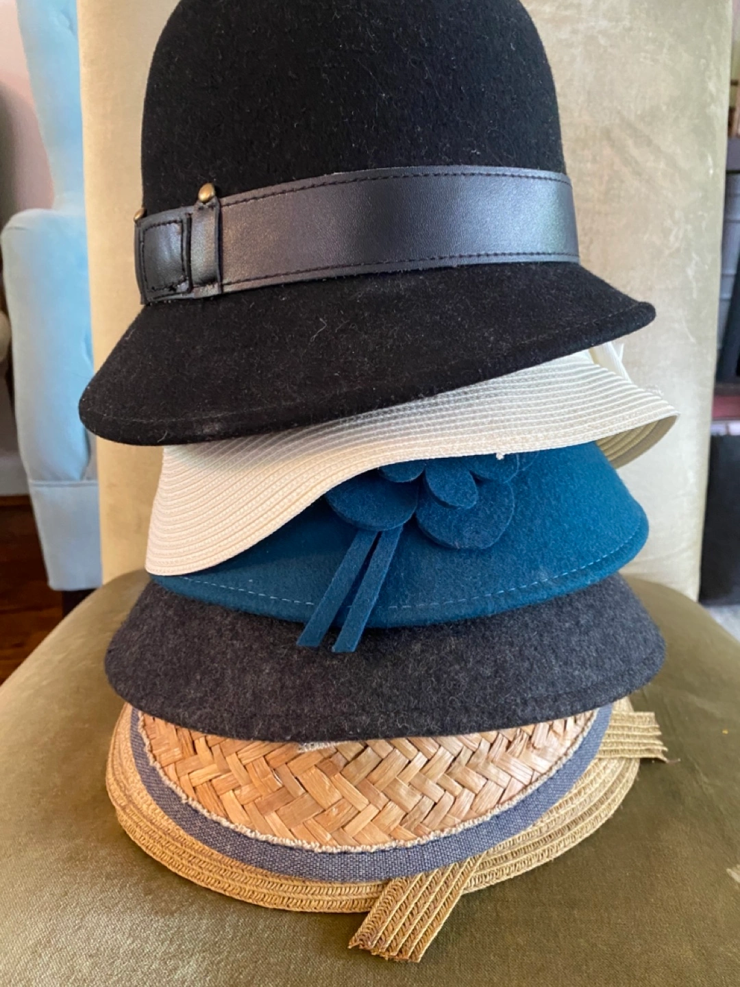 Selling a collection of cloche felt and straw hats! There's a black one with a leather band, a grey one with a ribbon, a white straw hat, and a teal one with a flower detail and much more. They're all in good shape and ready for a new home.