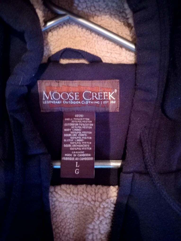 Cozy Moose Creek hoodie with a sherpa lining to keep you warm! It's a size large and made with a shell of 70% cotton and 30% polyester. The body and sleeve lining are 100% polyester. Perfect for those chilly Canadian days