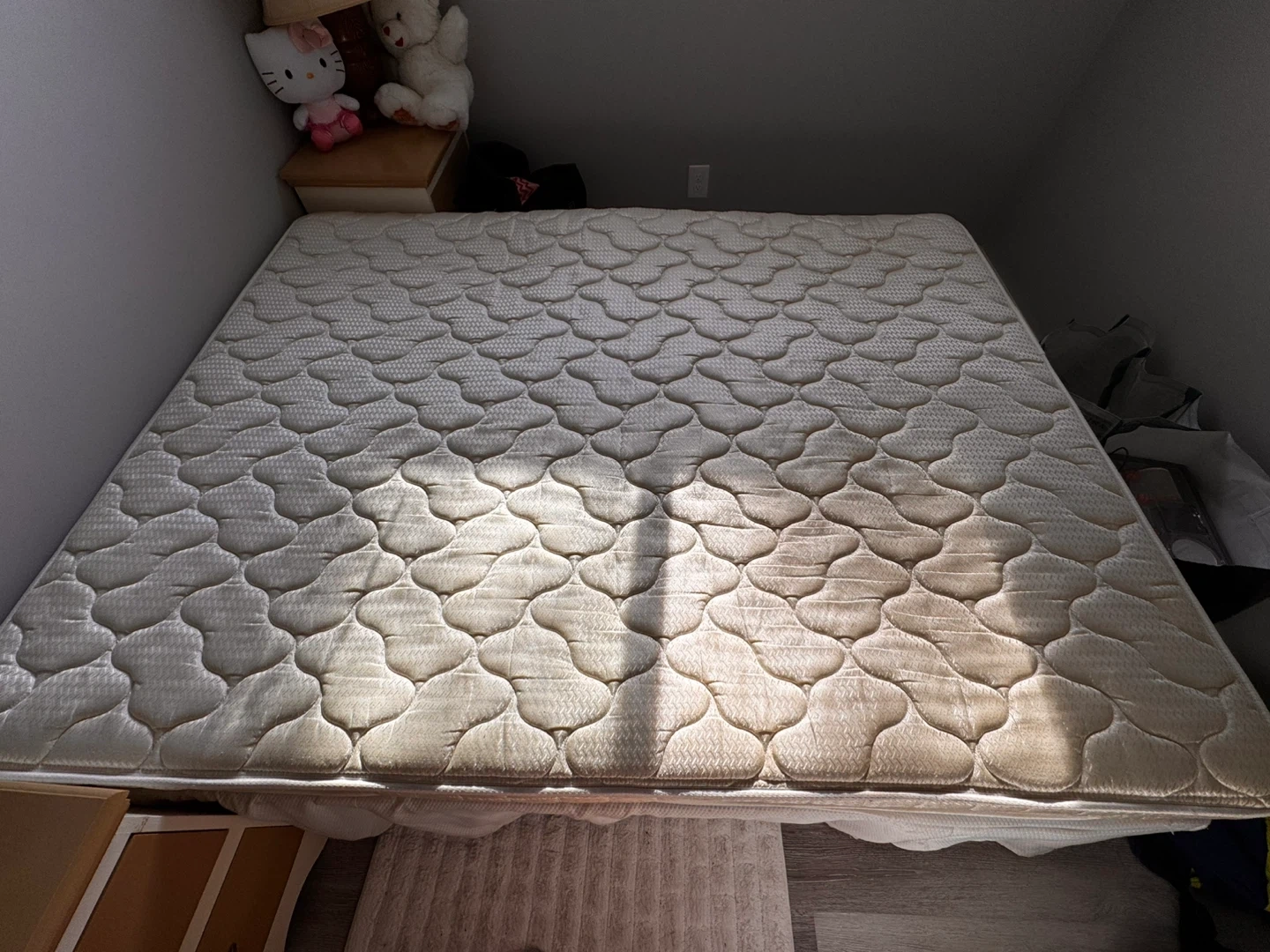 Selling a queen size bed frame and mattress! It's in good condition and ready for a new home. Perfect for a guest room or anyone needing a comfortable place to sleep