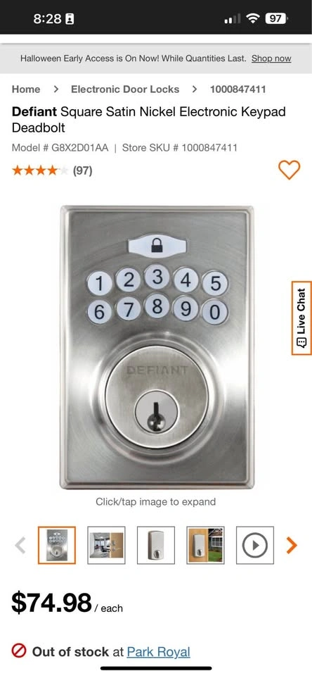 Buy & SellDefiant keypad lockDefiant keypad lock$20Defiant keypad deadbolt lock, used just a few months then change to a smart deadbolt.WHERE TO MEETCheck LocationView MapSELLERAlanGuildford150 reviews0 chats·0 favorites·3 viewsSEND CHAT TO SELLERHi Alan! I’m interested in your listing.Hi Alan! I’m interested in your listing.Get the Karrot app to chatSign In to chat