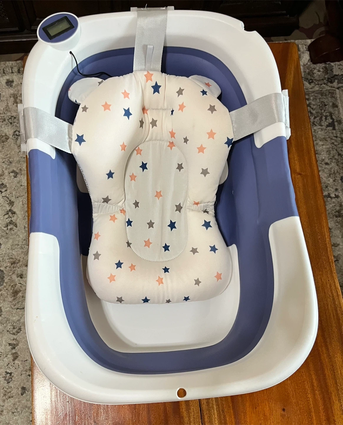 Selling a foldable baby bathtub in great condition! It comes with a supportive pad. The bathtub is designed with a digital thermometer for easy temperature monitoring. Easy to store when not in use.