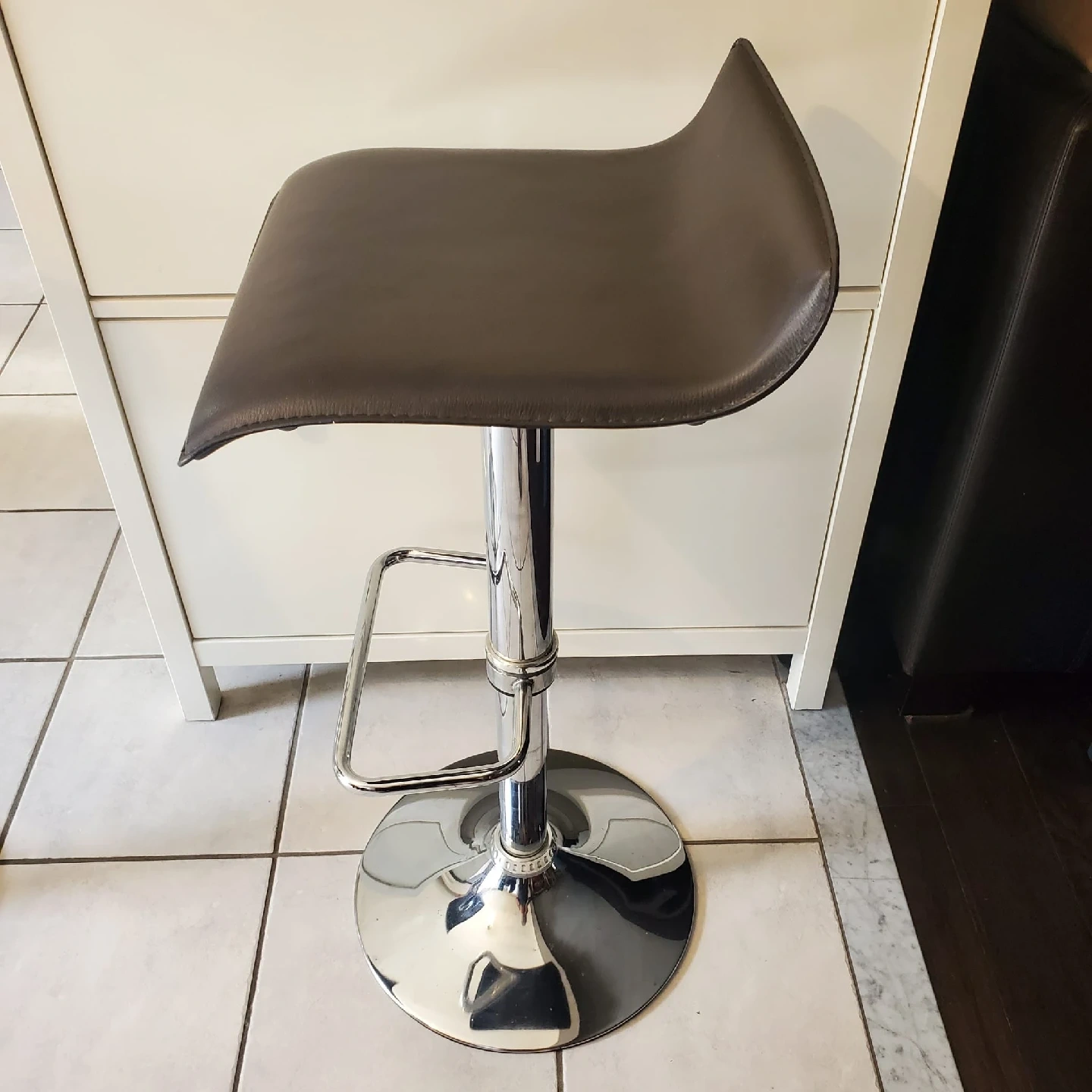 Add a touch of modern elegance to your kitchen or bar area with these stylish bar stools featuring sleek chrome bases and comfortable dark brown seats. These stools are perfect for adding seating to your kitchen, island or home bar. In great condition
