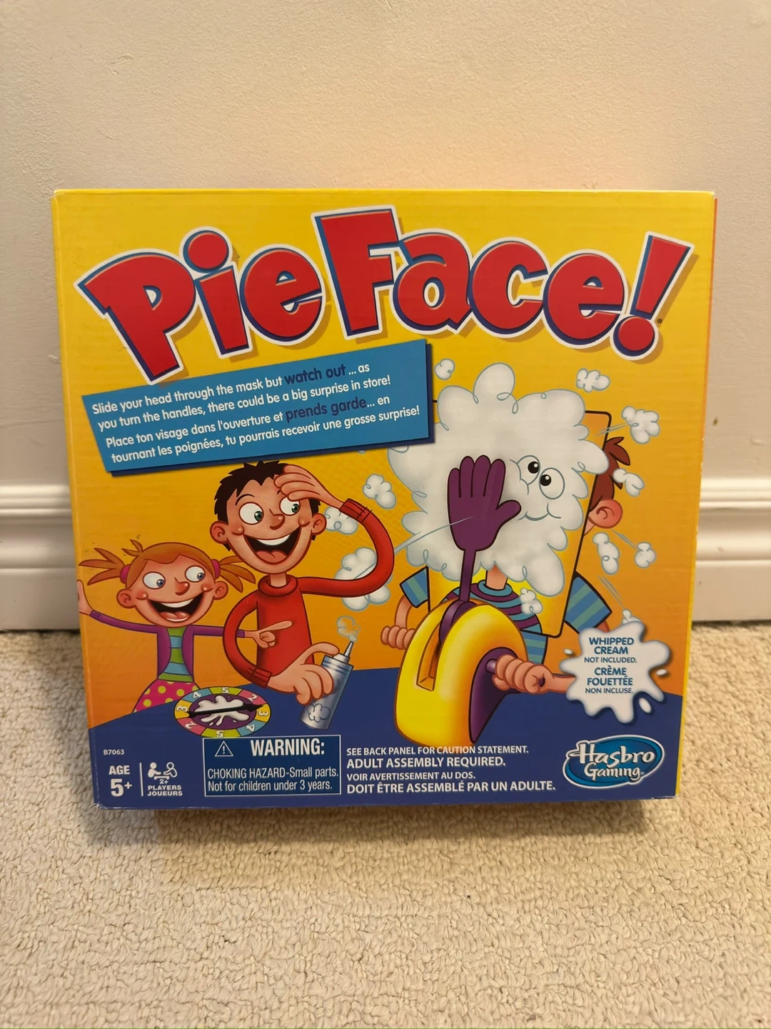 Selling the Pie Face! game by Hasbro Gaming! It's a fun game for ages 5 and up, and can be played with 2 or more players. Just slide your head through the mask, turn the handles, and watch out for a big surprise! Please note that whipped cream is not included.