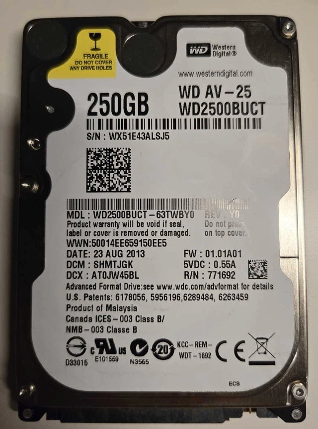 Reliable 2.5" internal hard drive, ideal for laptops, DVRs, or backup storage. Model: WD2500BUCT (AV-25 series) Capacity: 250GB Date: 23 Aug 2013 Interface: SATA Form Factor: 2.5-inch ✅ Tested and working ✅ Great for replacement, repair, or additional storage Pick up at 50 Brian Harrison Way, Scarborough Cash Only