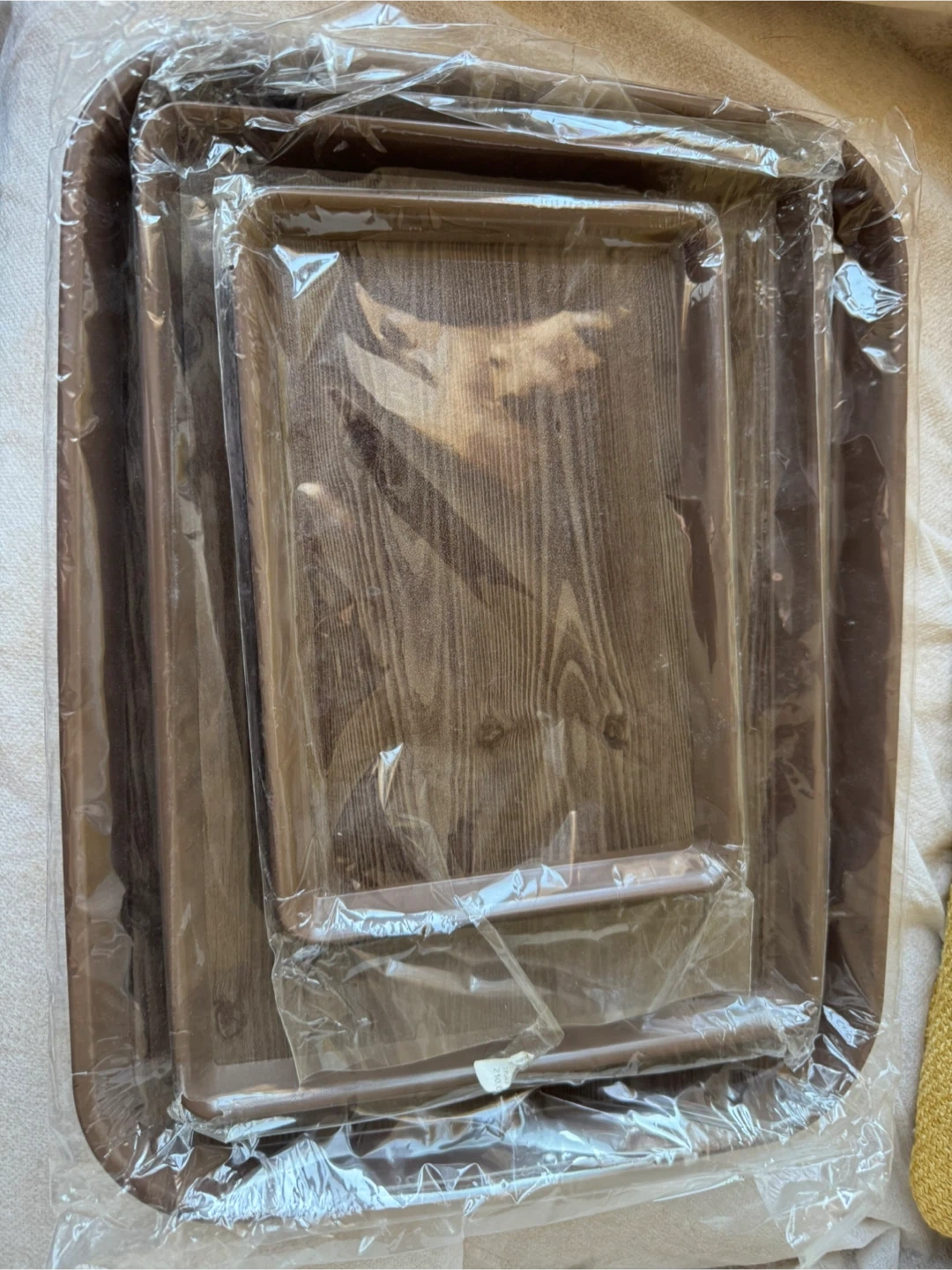 Selling a brand new set of three serving trays! They have a nice wood-look finish and are still in their original packaging. Perfect for serving snacks or drinks to guests