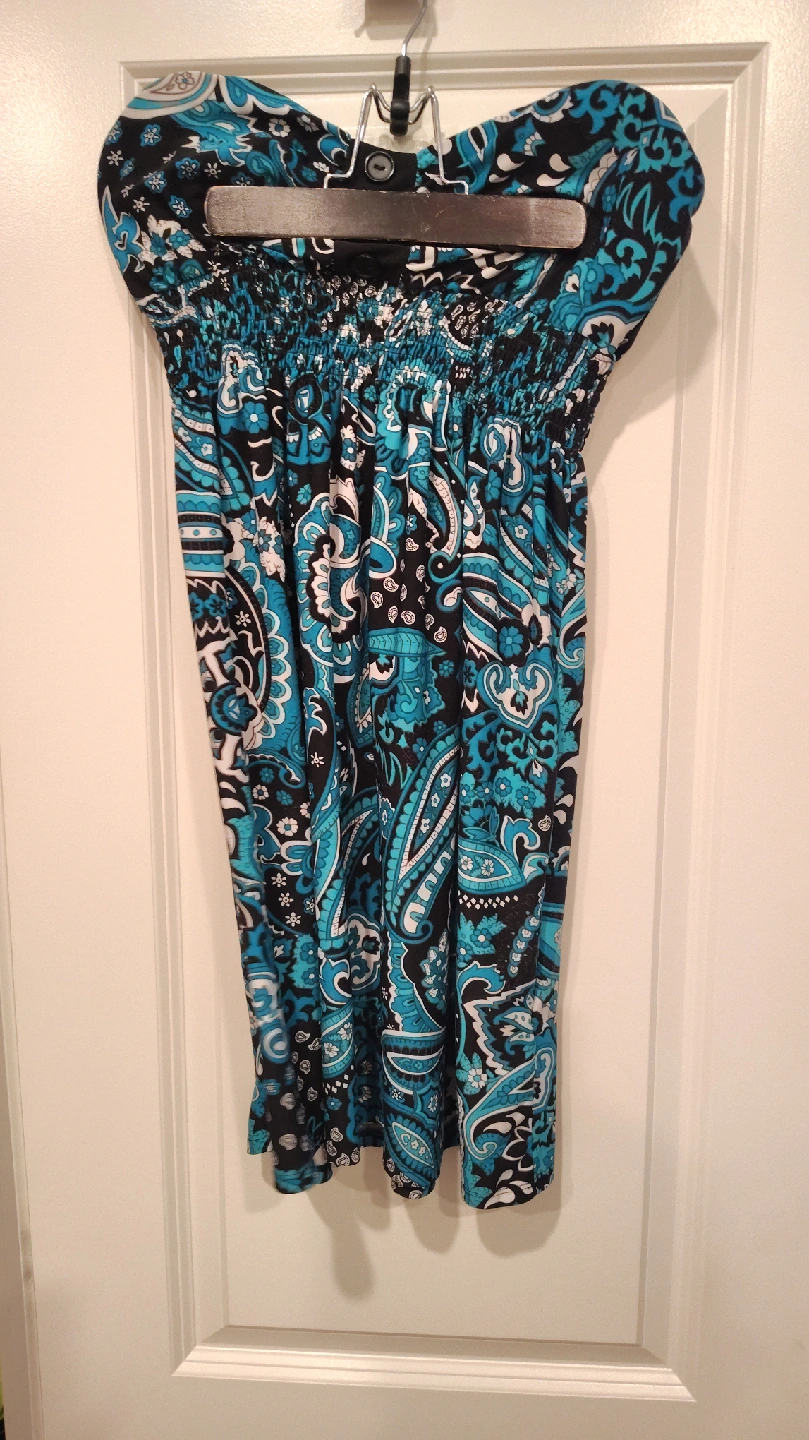 65Cute Majora dress in size M! It's a fun turquoise, black, and white paisley print with 3 black buttons at the top. Great for summer, and never worn!! No zipper, stretchable just enough to make it the perfect dress whether you're out for a date night stroll or extend its wearability across seasons by adding a black sweater and/or black or white tights and head off to school or work!