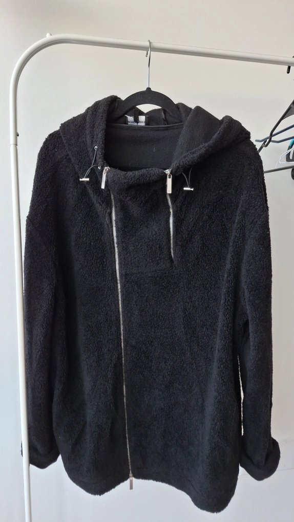 Selling a cozy black hooded jacket from Emporio Armani in size XL! It's a stylish and comfortable piece, perfect for layering during cooler weather. The jacket features a unique asymmetrical zipper design. It is made from a soft, textured material.