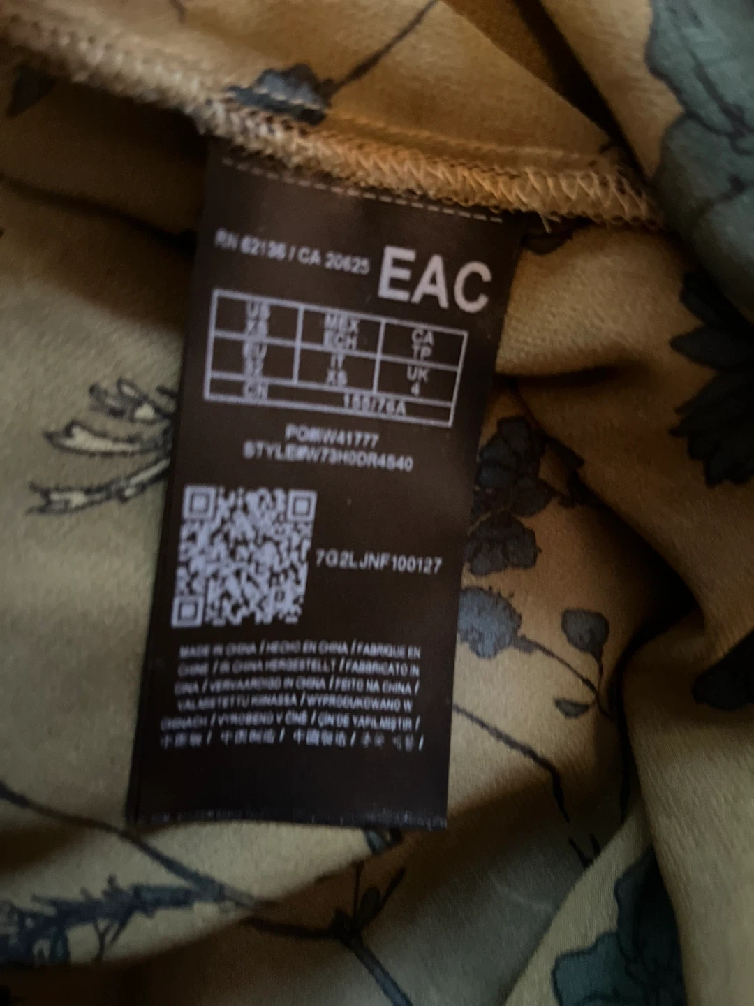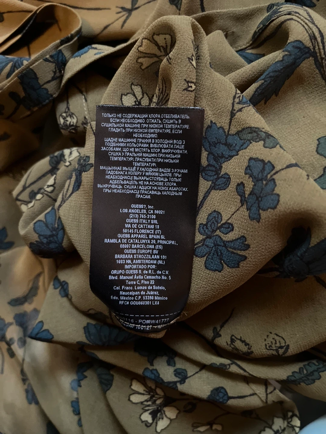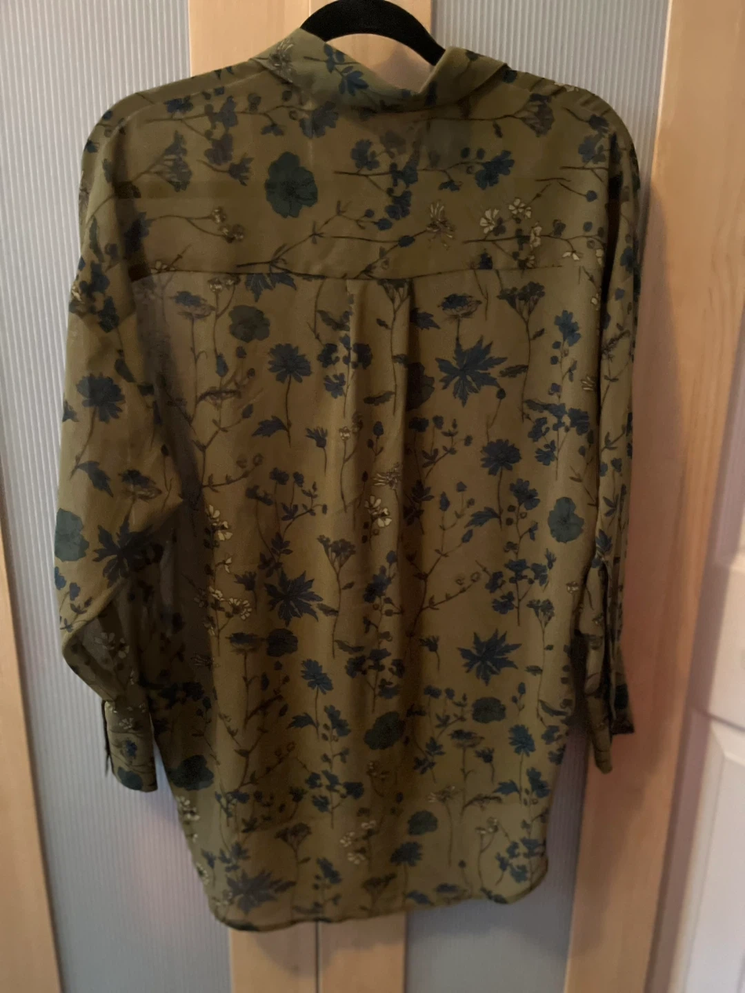 This is a Guess blouse in size XS. It features a beautiful blue floral print on a light olive green background. It’s a light material. I think it would look great layered over a tee like a sweater.