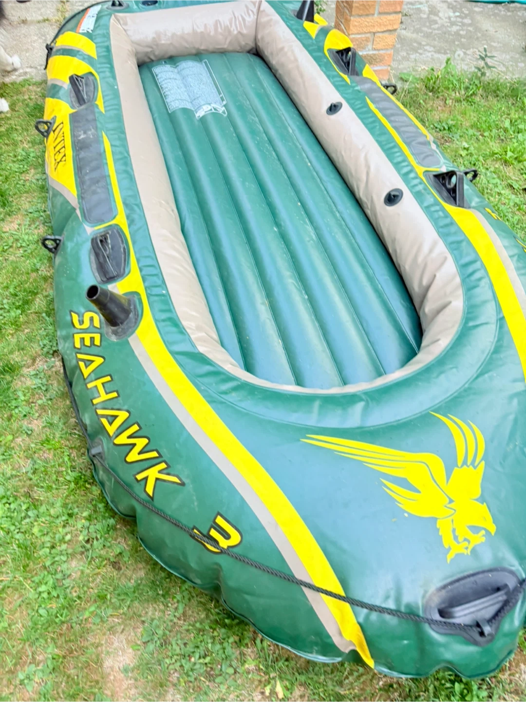 Selling an Intex Seahawk 3 inflatable boat. It's green with yellow accents and features the Seahawk logo. Perfect for a fun day on the water!