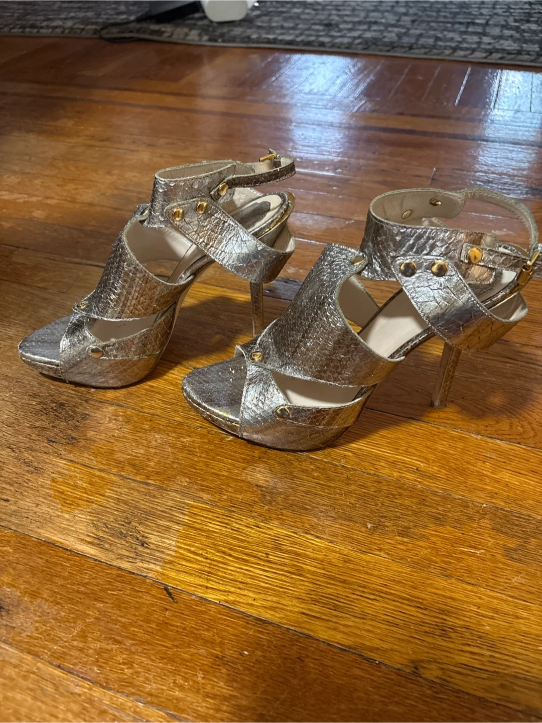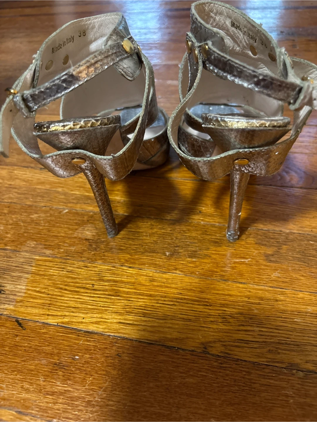 Selling a pair of Christian Dior gold metallic heels in size 38. They have some signs of wear, but are still in good condition! 4 1/2” heel