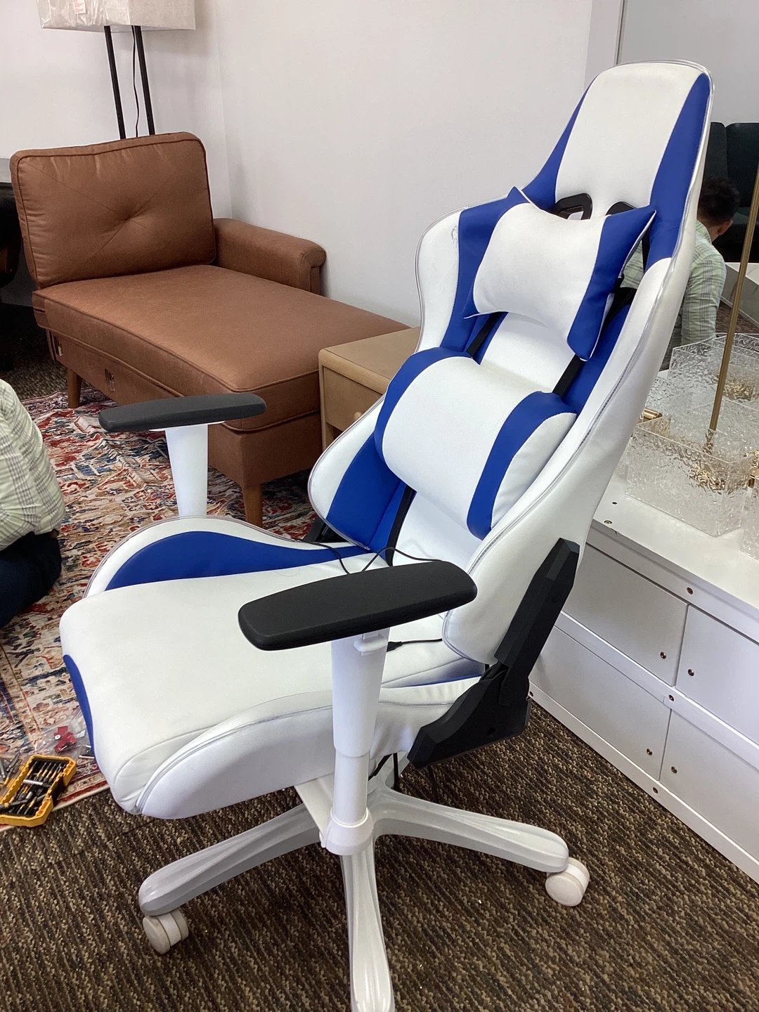 Selling a comfy gaming chair in great condition! It features a blue and white design, perfect for any gaming setup. The chair includes a headrest pillow and lumbar support for extra comfort during those long gaming sessions