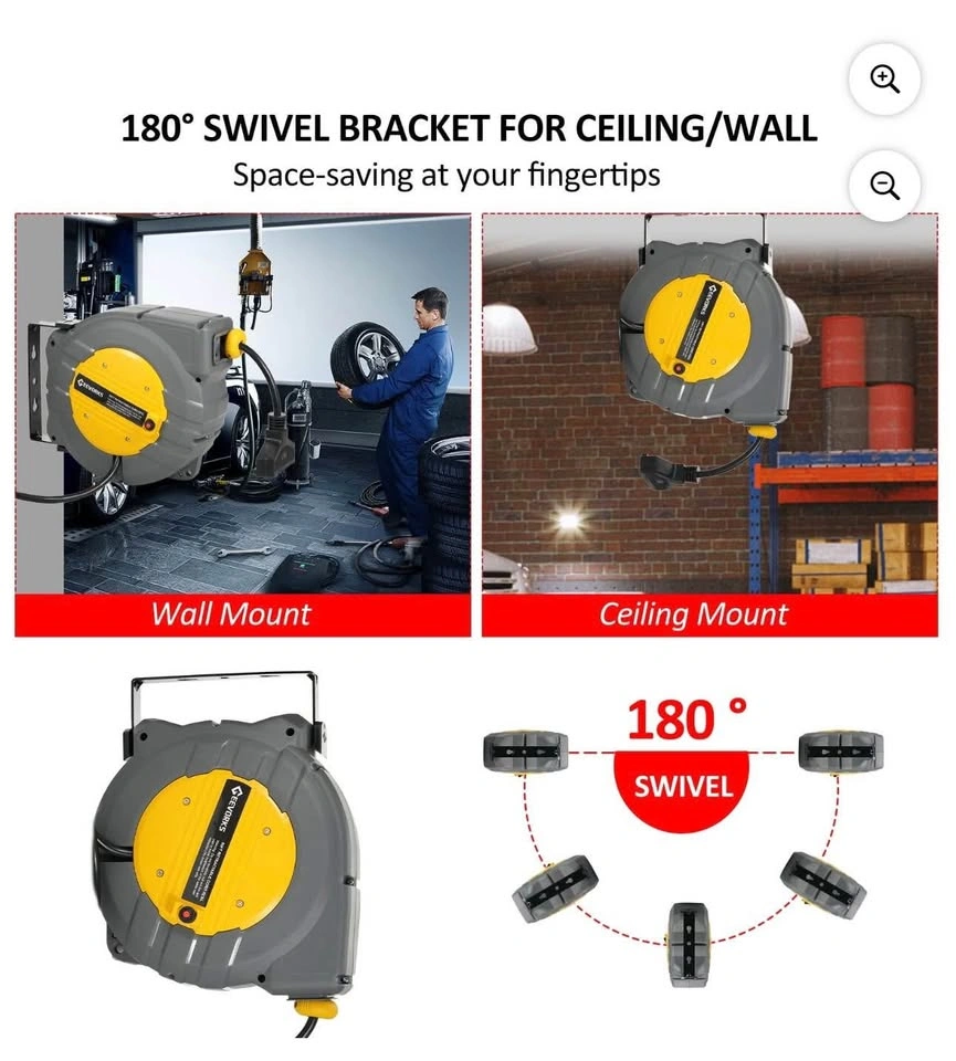Retractable cable reel use the polypropylene case resists oil and grease, improve the service life of the machine, and the cord is waterproof; please note that it is recommended to use the cable reel in a dry environment. Rated for 15.6A/ 120V/ 1875W; 12AWG. When the rated current or voltage is exceeded, the circuit breaker will be automatically disconnected to protect the device from damage; Press the red button, cord reel can be re-used. The cable reel can be mounted on a wall or ceiling; It supports 180 degree rotation. With an adjustable stopper, you can adjust to the length you like, avoiding wire entanglement and scattering.