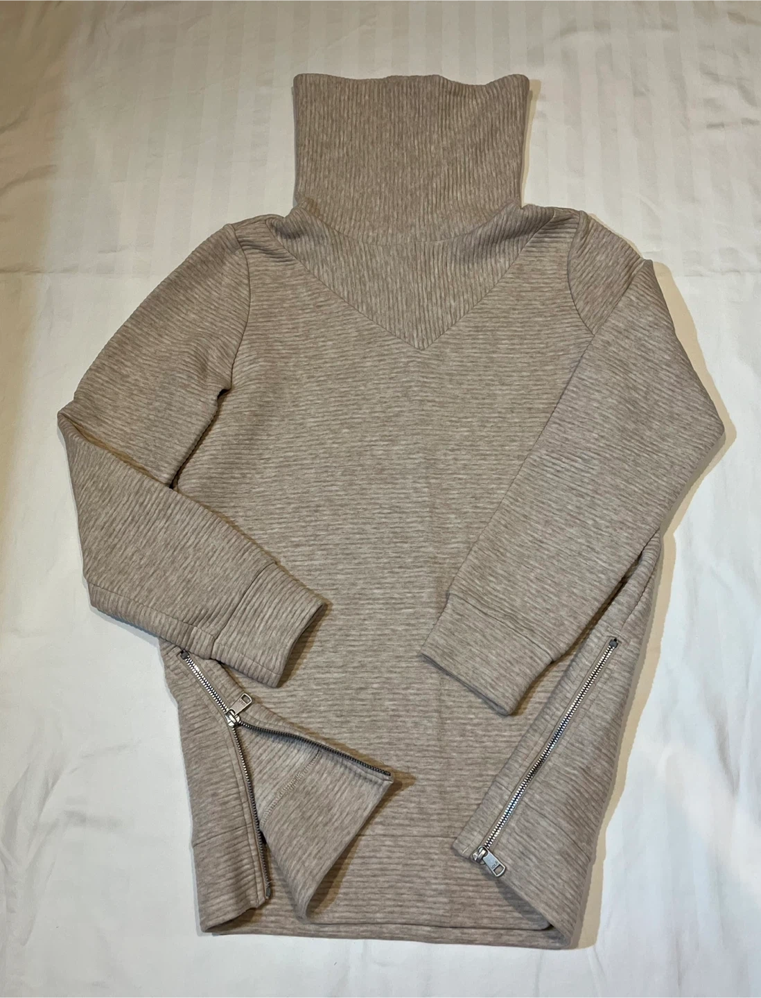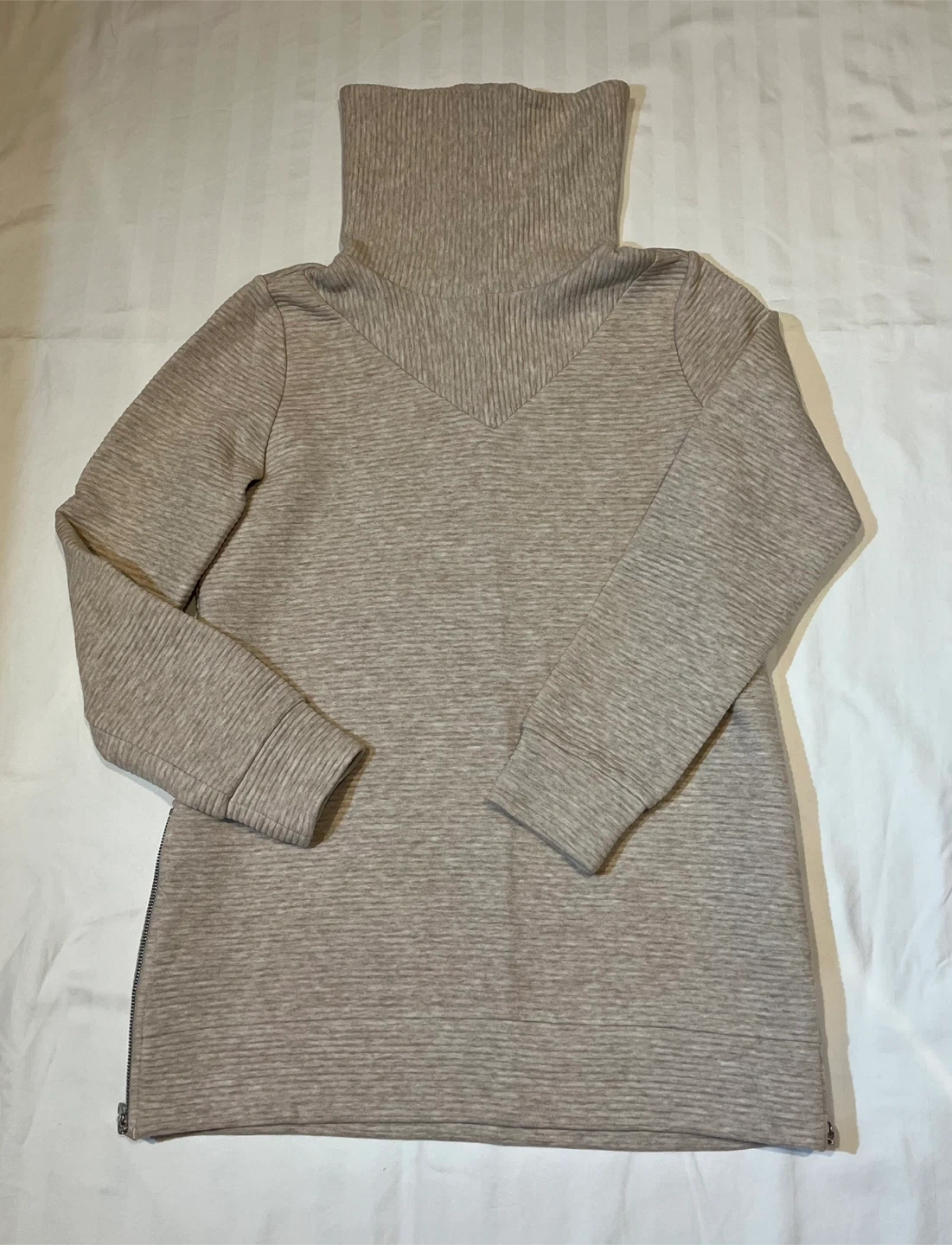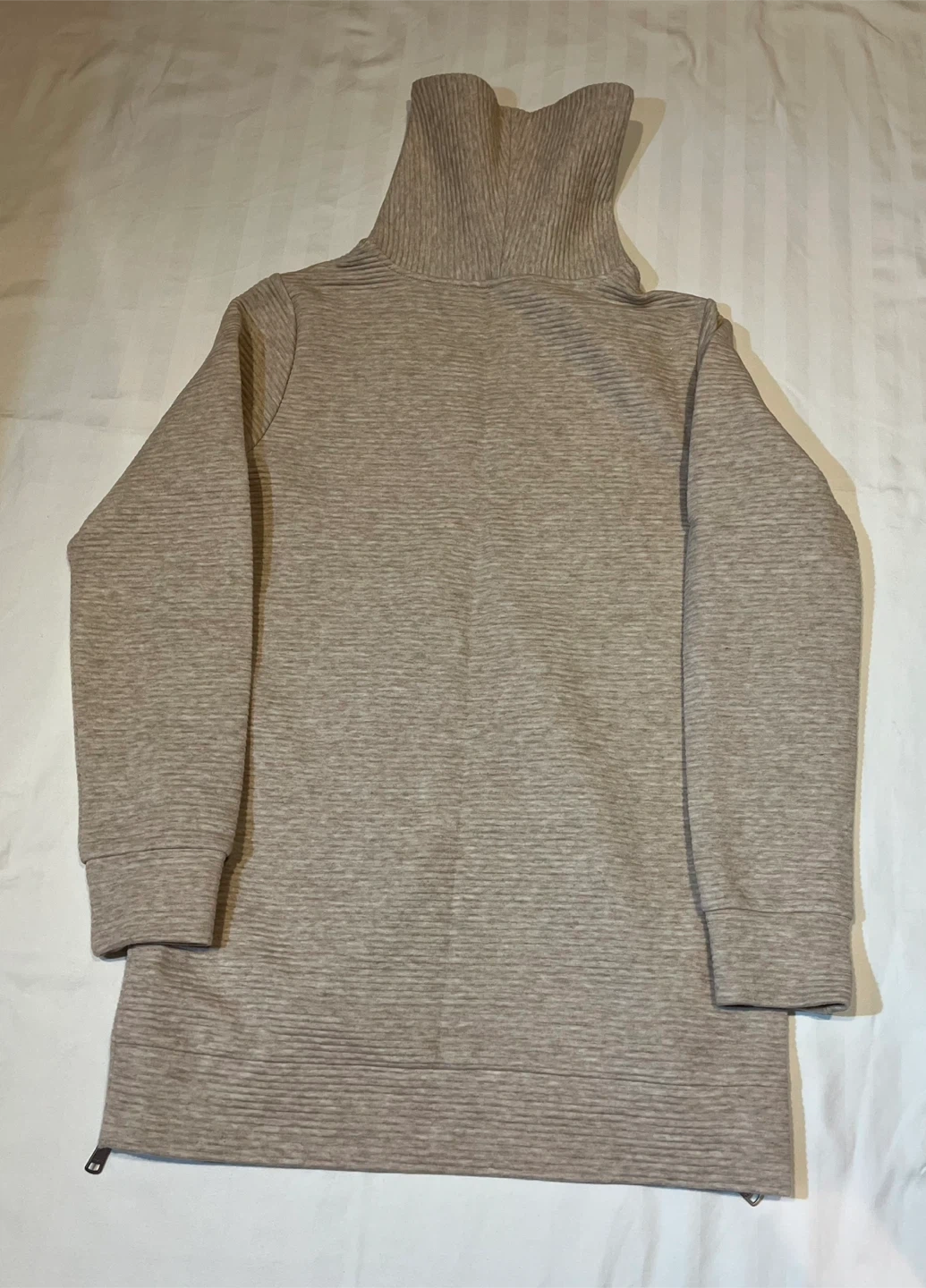 Gently used. Selling a Lolë ribbed turtleneck tunic in size small! It's a stylish and comfy piece, perfect for layering or wearing on its own. The beige colour is versatile and the ribbed texture adds a nice touch. It also features zippers on the side!
