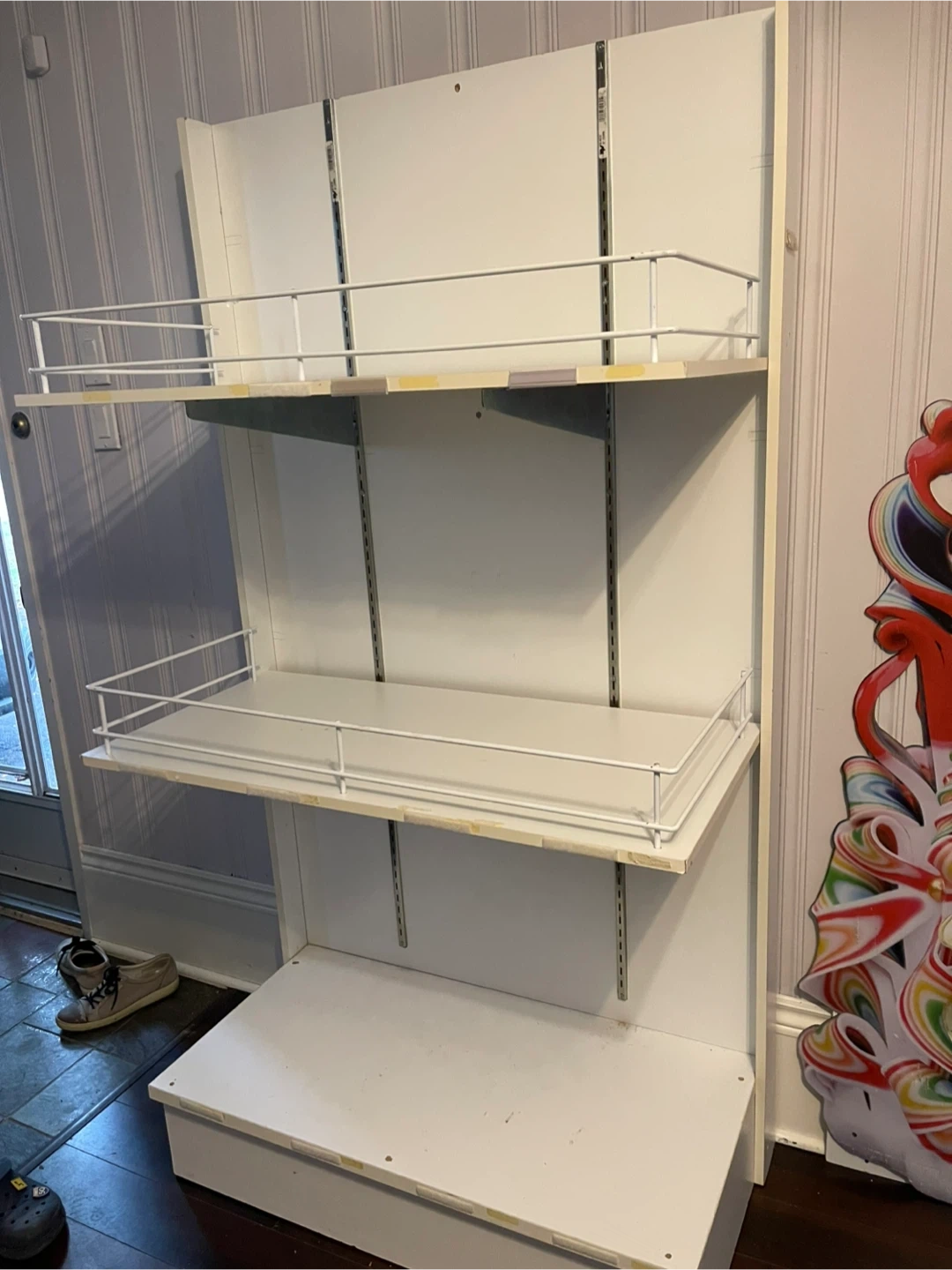 This shelving unit is perfect for displaying retail products or for use in a home setting, offering ample storage with its sturdy build and adjustable shelves. The unit is in fair condition, showing some signs of wear, which is reflected in the discounted price. Perfect for someone that is just starting their business or is looking for cheap storage. Please note that this is a used item. There are 2 pieces available, one of them is double-sided but can also be single-sided.