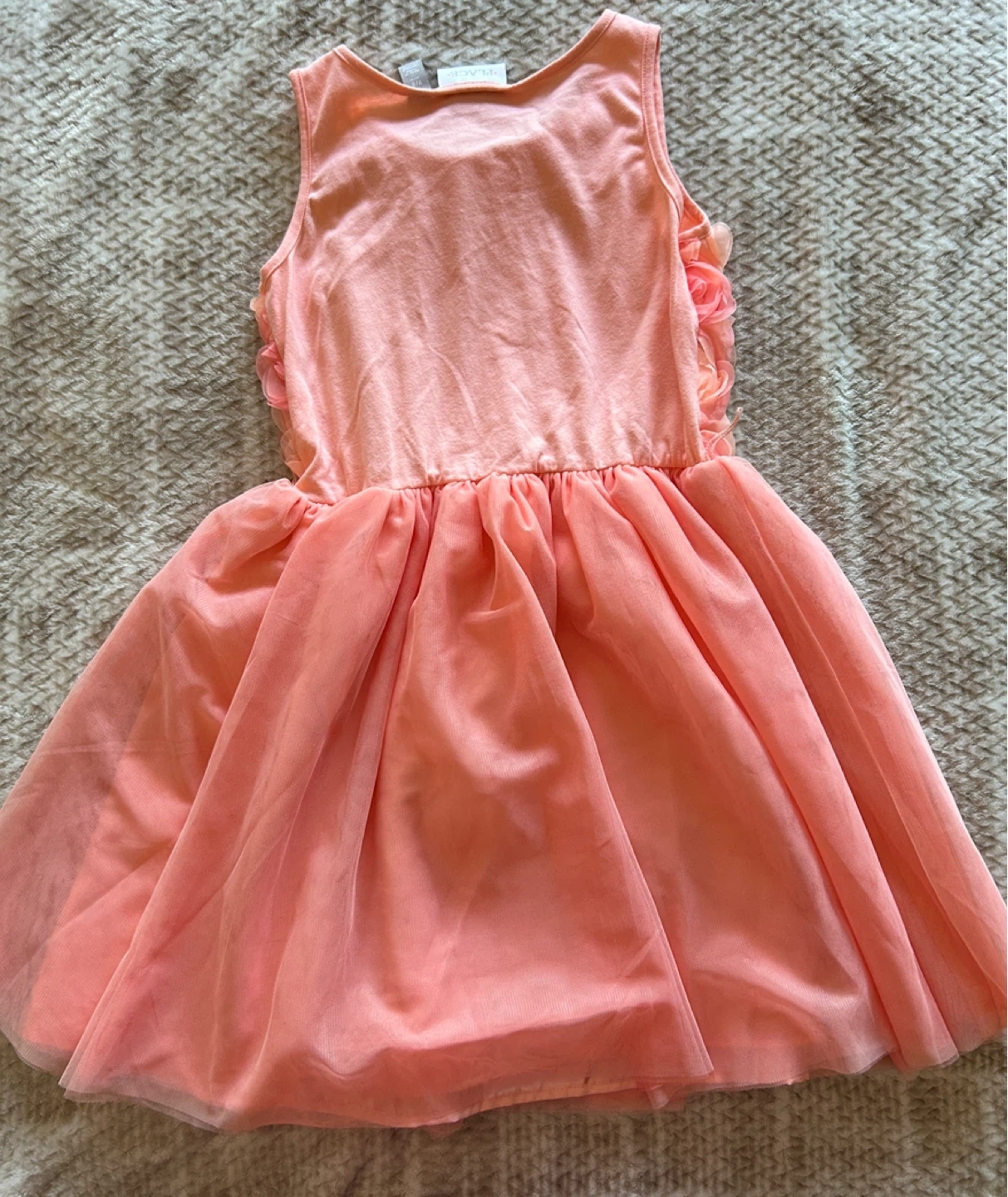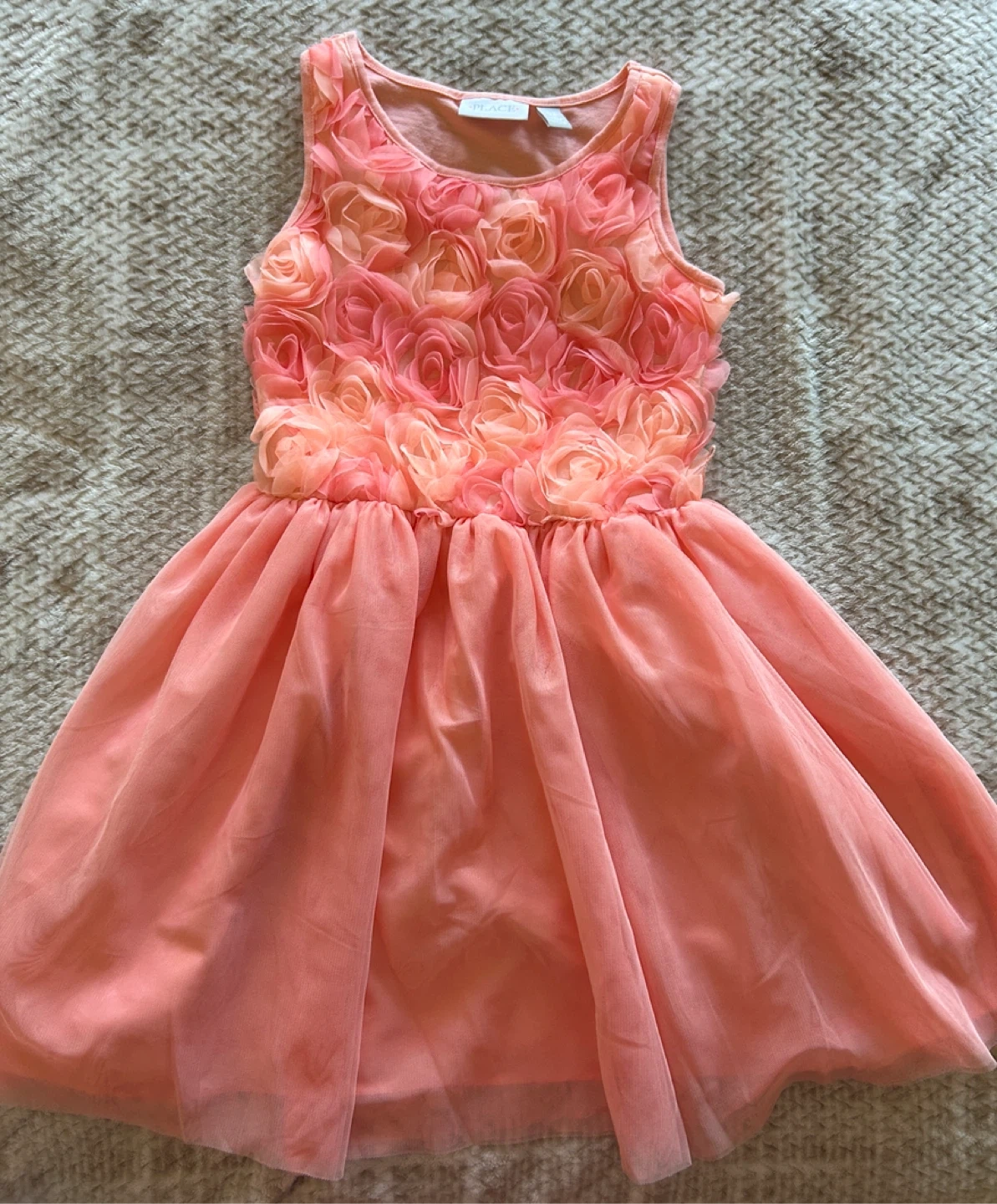 A very cute The Children’s Place - dress in a lovely coral colour! The bodice has a beautiful rose design and the skirt is a flowy tulle. It's in great condition and perfect for parties or special occasions. Available sizes Size 7/8 Size 14