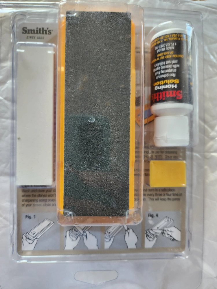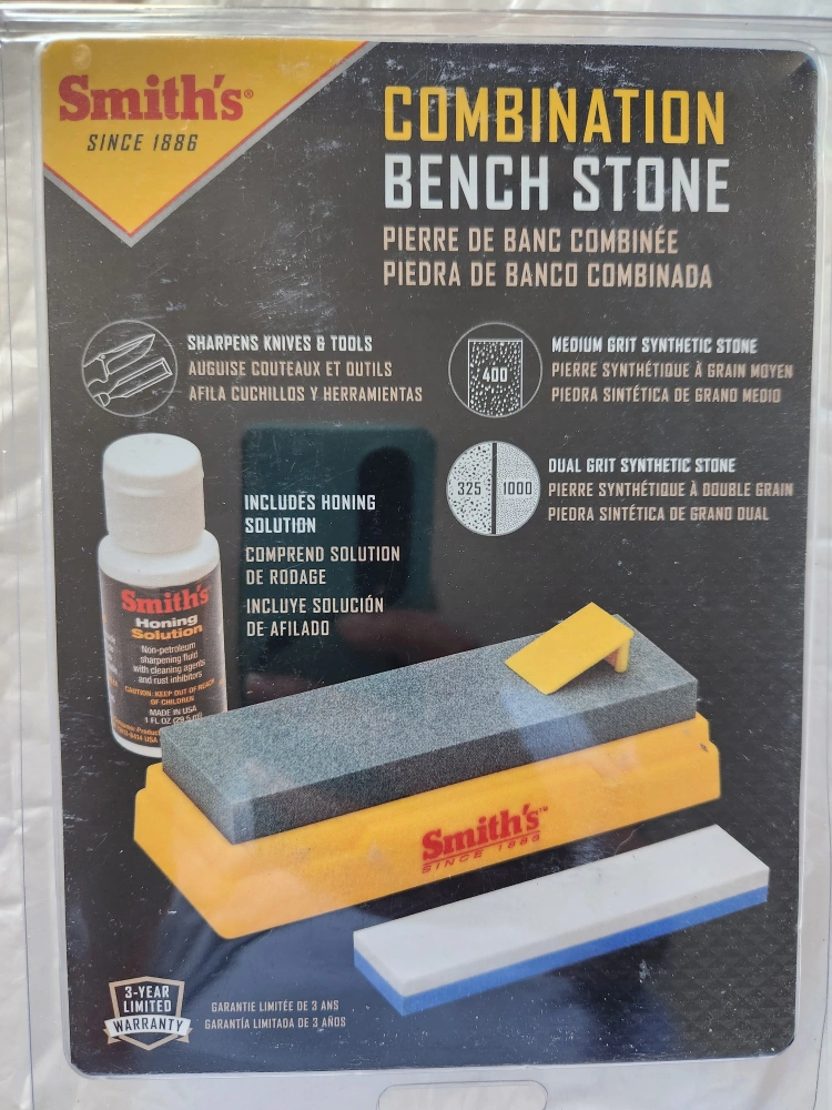 50Get your knives and tools razor-sharp with this Smith's Combination Bench Stone! This kit includes a medium grit synthetic stone (400 grit) and a dual grit synthetic stone (325/1000 grit). Also includes honing solution to keep your stones in top condition. Sells new on Amazon for 35 plus tax. Please check my other listings.