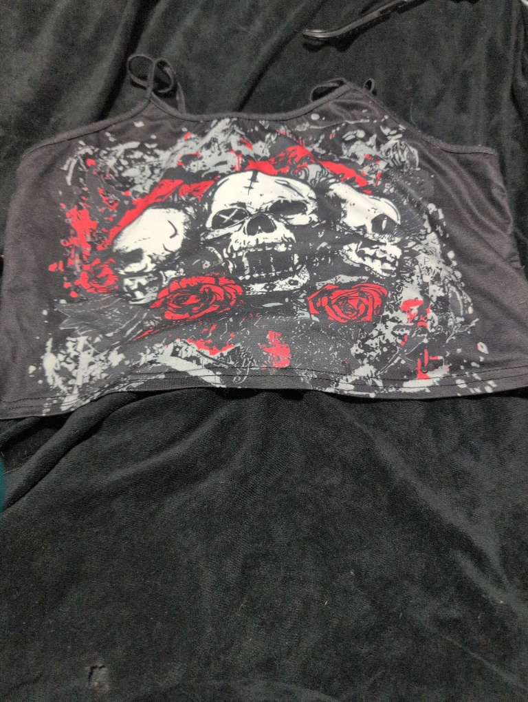 Selling a black tank top with a skull and roses print. It's in good condition and features a unique design. Perfect for adding a bit of edge to your wardrobe!
