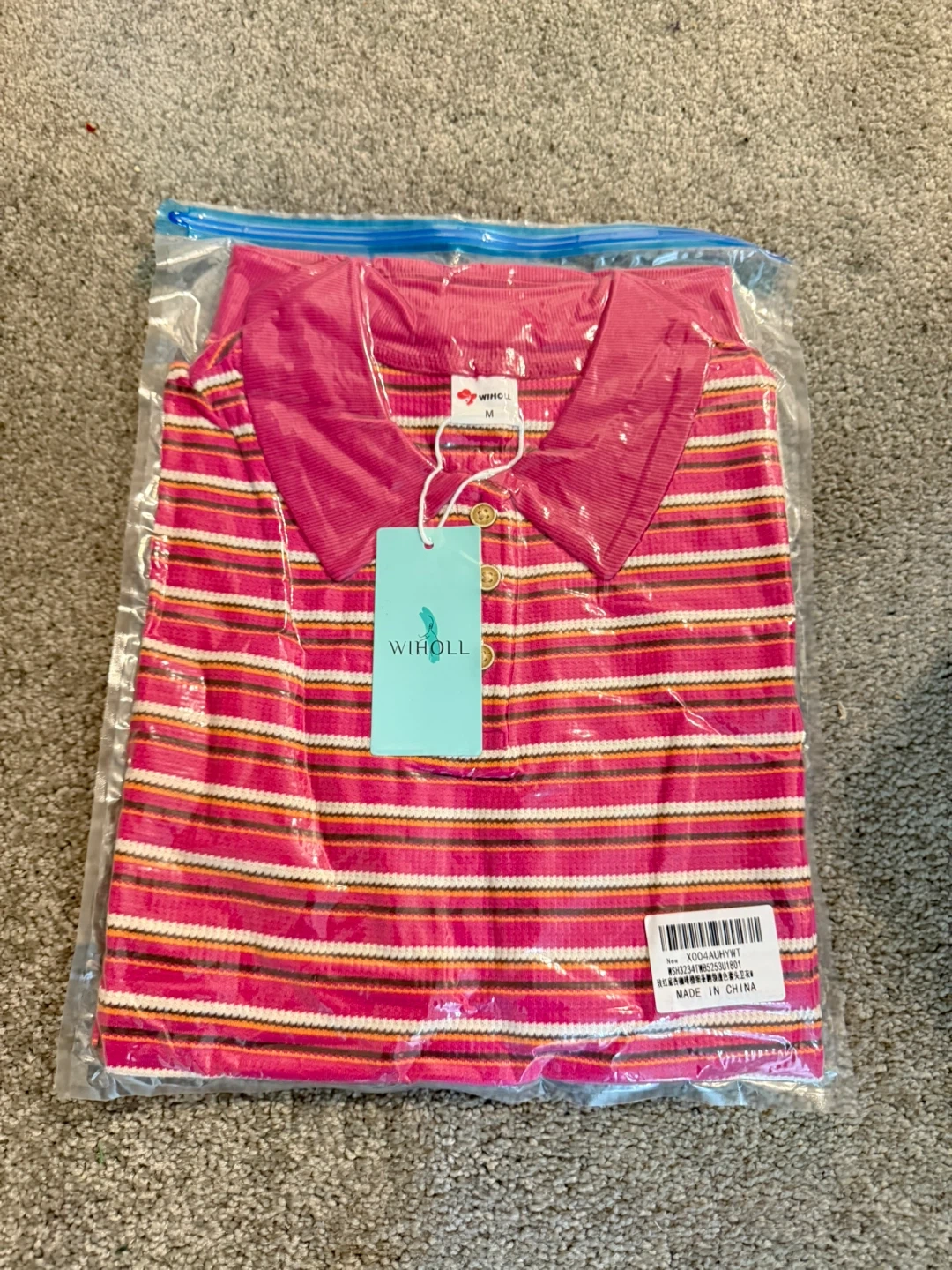261This is a brand new WIHOLL striped polo shirt in size M! It's still in the original packaging and has never been worn. The shirt features a vibrant pink, orange, and white striped pattern with a classic polo collar and button-up design. Perfect for adding a pop of colour to your wardrobe!
