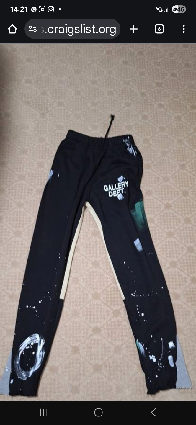 Selling a pair of Gallery Dept. sweatpants in black. They feature a unique paint splatter design. These are super comfy and stylish, perfect for casual wear