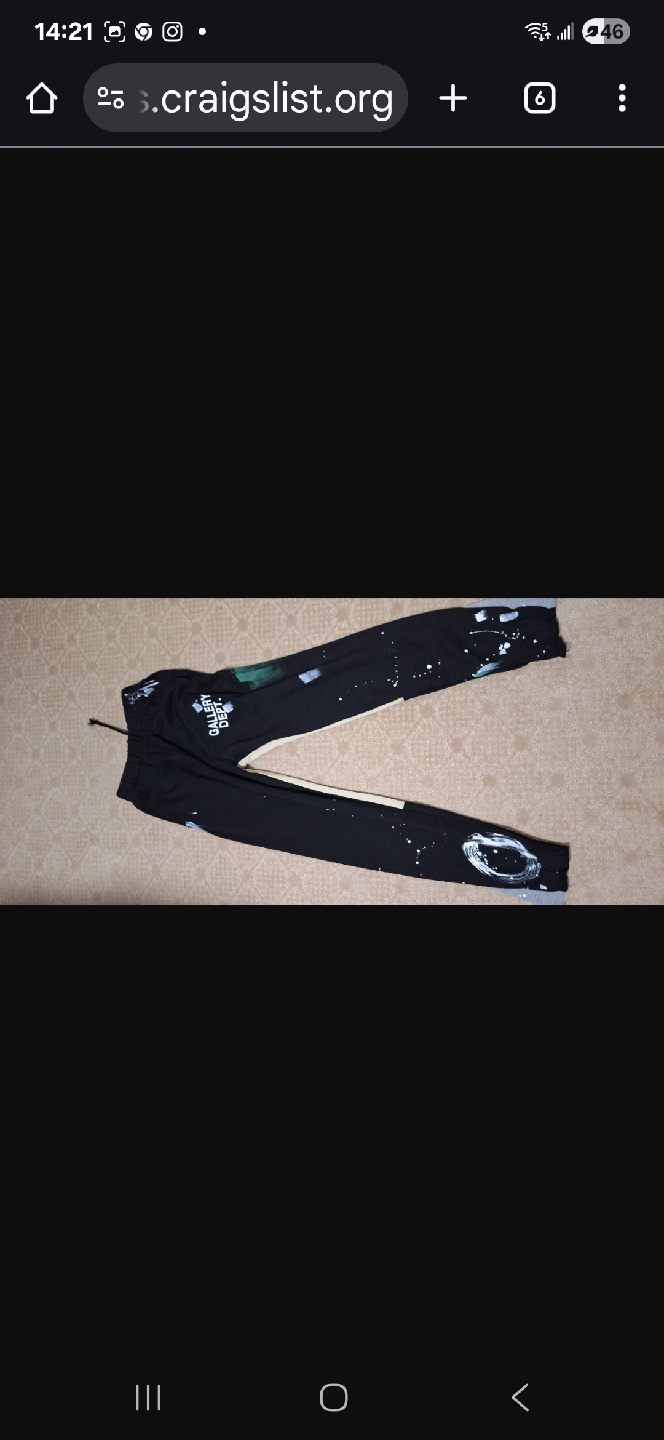 Selling a pair of Gallery Dept. sweatpants in black. They feature a unique paint splatter design. These are super comfy and stylish, perfect for casual wear