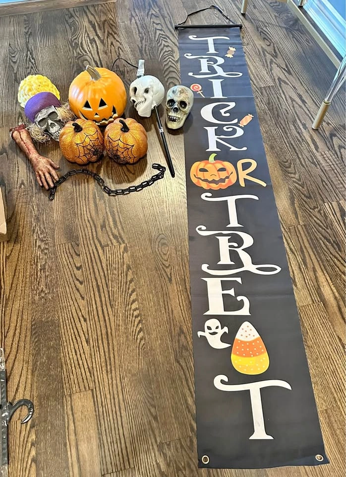 Getting ready for Halloween? I have a bundle of decorations including pumpkins, skulls, a zombie arm, a chain, and a 'Trick or Treat' banner! Perfect for getting your home spooky for the season. The pumpkin in the back lights up. The brain is for the top of a carved pumpkin. Does need the pins but you can use any or nails. $10 for all.