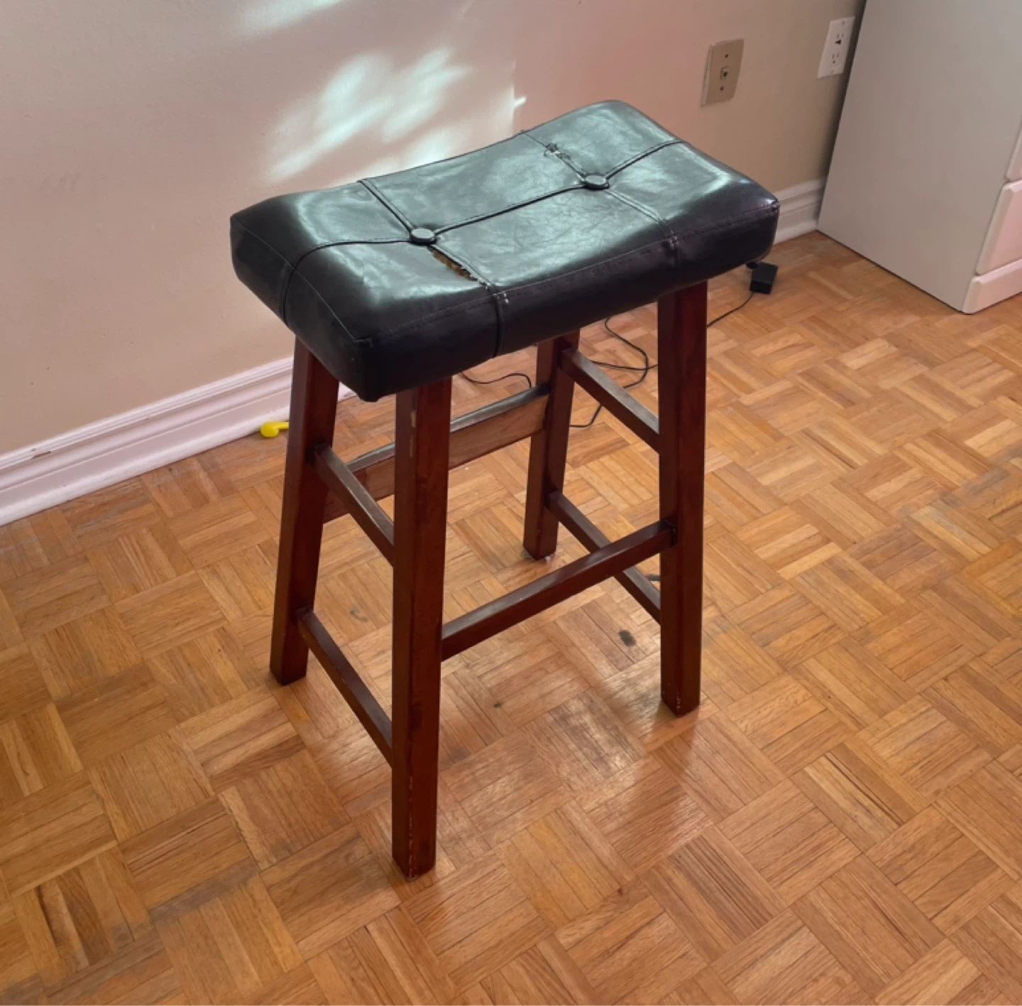Solid Wooden Stool with Padded Cushion โ $40 Up for sale is a strong and reliable wooden stool with a comfortable padded cushion seat. This stool is built to last, with a sturdy wooden frame and crossbars for extra stability. The black cushioned seat is upholstered in an easy-to-clean leather-style material, with a stitched design that gives it a modern and stylish look. โ Key Features: โข Durable solid wood frame, built to handle daily use โข Comfortable padded cushion with stitched detailing โข Crossbar supports on all sides for added stability and footrest options โข Sleek, compact design that fits well in bedrooms, living rooms, kitchens, or workspaces โข Versatile height โ great for use at counters, desks, or as extra seating ๐ Approx. Size: Standard counter-height stool (comfortable seating height for most counters and tables). This piece is practical, space-saving, and neutral enough to fit any dรฉcor. Whether you need an extra seat for guests, a spot to sit while working on hobbies, or just a sturdy everyday stool, this does the job perfectly. ๐ฒ Price: $40 (firm) ๐ Pickup only