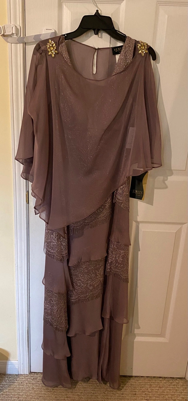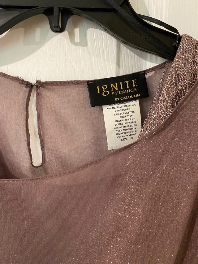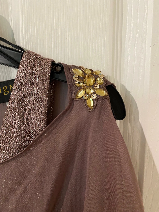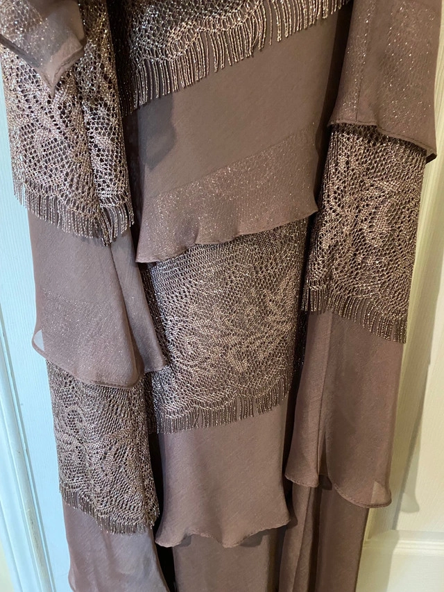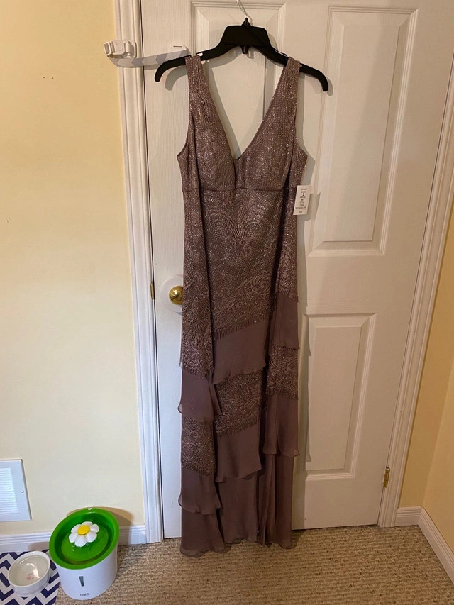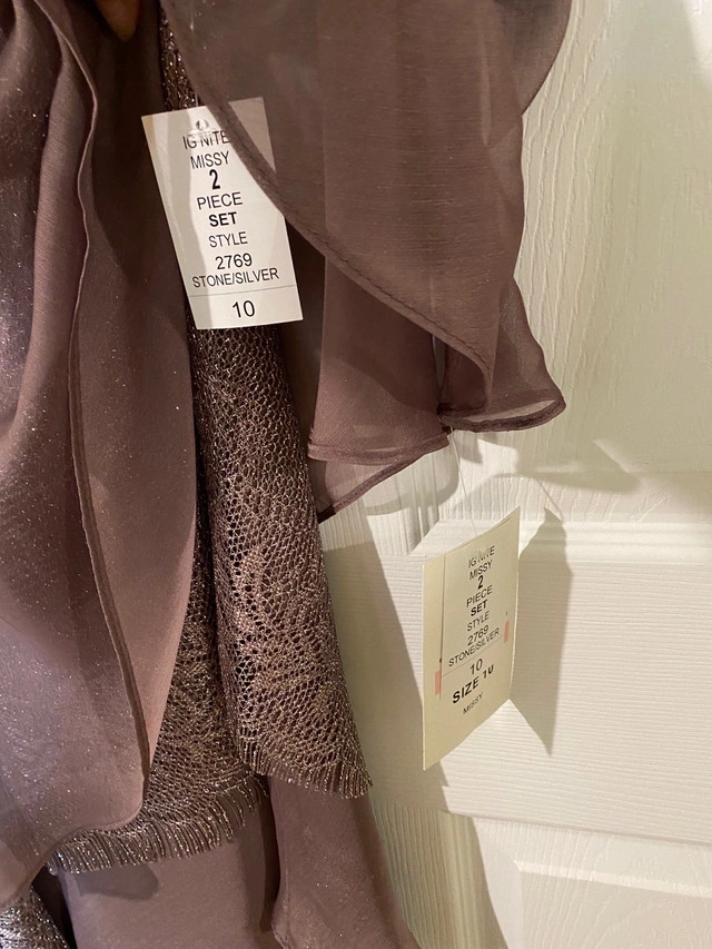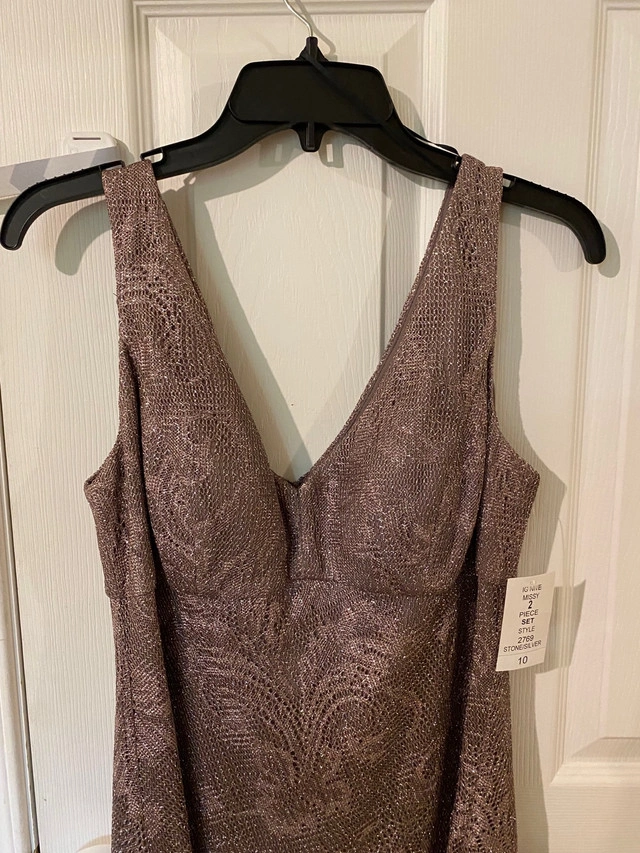 20BNWT Absolutely stunning formal gown and removable shift cape / shawl. The detailing is second to none! Colour is stone / silver, it has a beautiful shimmer to it. Size 10, bought in the USA so cannot return. Would make a beautiful mother of the bride or mother of the groom dress. Suitable for awards gala, red carpet! Pick up Bracebridge / Gravenhurst