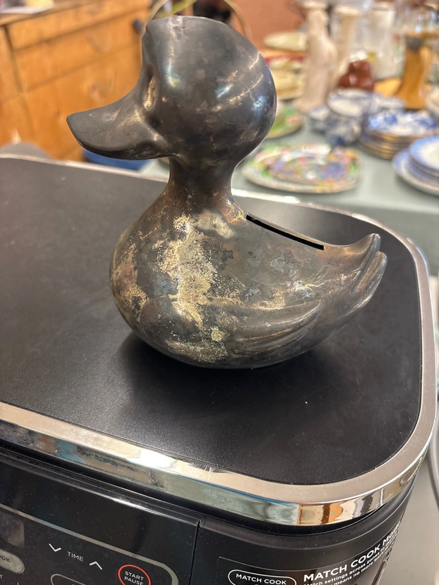 This is a used duck coin bank and makes for a great decorative piece, or a child's first savings vessel. This duck has a lot of wear from use, but still maintains its charm. Perfect for adding a touch of vintage flair to any room or collection! If the ad is still up, it's still available! I'm decluttering and this little ducky is ready to fly to a new home. * Material: Metal * Style: Vintage * Function: Coin Bank Based on similar listings, a fair price for this item is $25.00.