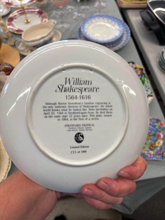 I'm selling a used Stratford Festival William Shakespeare commemorative plate. It's a limited edition plate, number 235 of 1000. It does show signs of its age but is in good condition. Great for any collector!