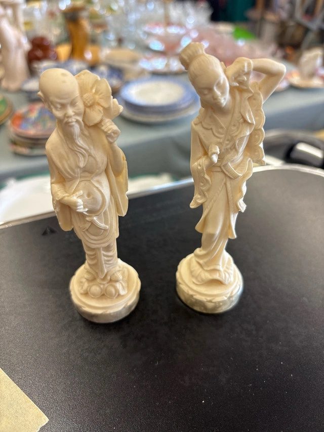 Enhance your collection with this set of two vintage faux ivory figurines, each showcasing intricate detailing and craftsmanship. These figurines, while displaying some signs of age, remain in good condition and capture the essence of traditional artistry. * Material: Faux Ivory * Style: Traditional * Condition: Used, with minor wear consistent with age I've checked around Kijiji, and similar figurines are typically priced between $20 and $40. Given the good condition and detail, I've priced this set at a competitive $35. Don't miss out on adding these charming pieces to your home. If the ad is up, they're still available!