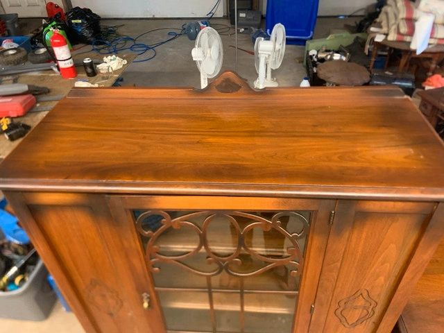 This beautiful antique china cabinet features solid wood construction with ornate glass door detailing, perfect for displaying your cherished items. This cabinet is a unique piece with classic design elements, though it shows signs of its age with some wear. This used cabinet offers both storage and display capabilities with it's interior shelves, making it a lovely addition to any dining room or living area. * Solid wood construction * Ornate glass door * Interior shelves * Lower drawer for additional storage. Given its condition, I've priced it competitively. If this ad is still up, the cabinet is available!