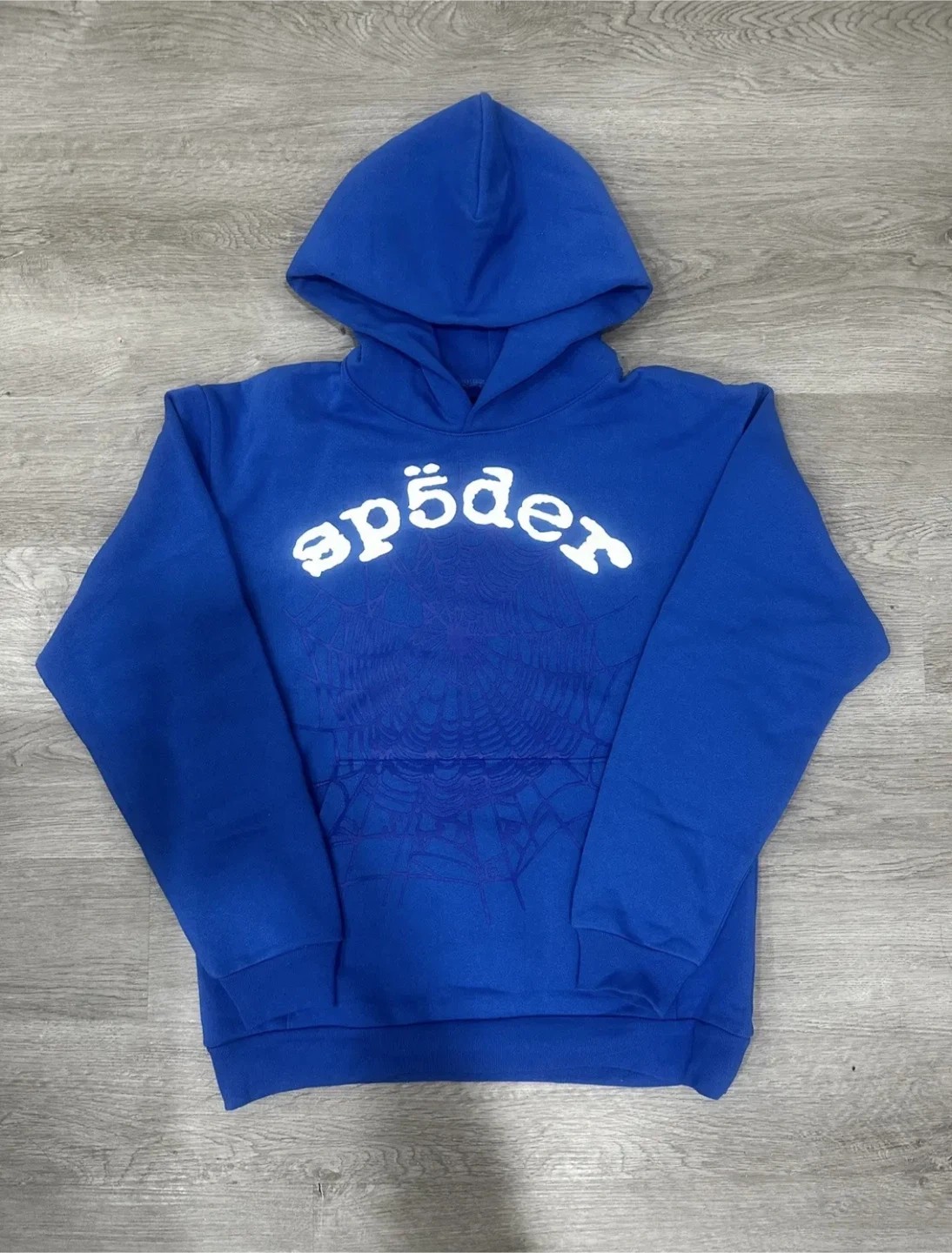 Selling a blue SP5DER hoodie! It features the brand's name in white across the chest and a spiderweb design. It's in great condition and ready for a new home