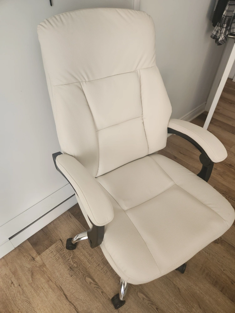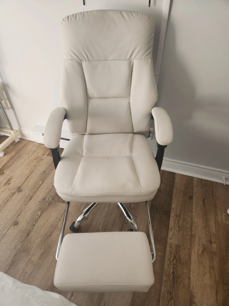Selling a comfortable cream-coloured faux leather office chair. It features a supportive high back and armrests for those long work days. The chair also comes with a convenient footrest for added relaxation. The base is chrome and has wheels for easy movement around your workspace.