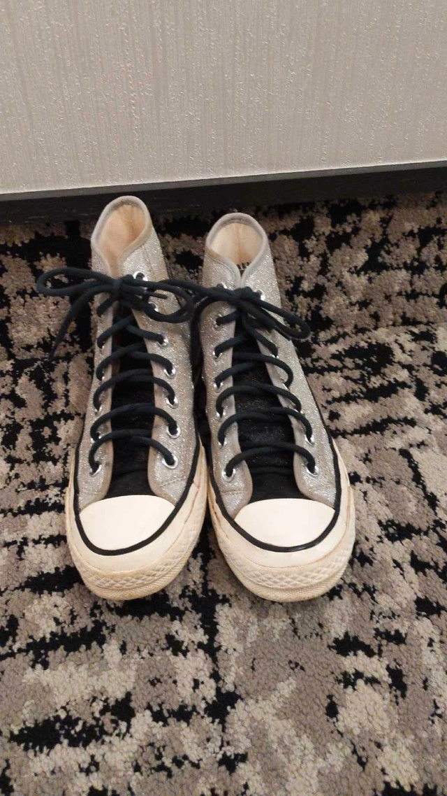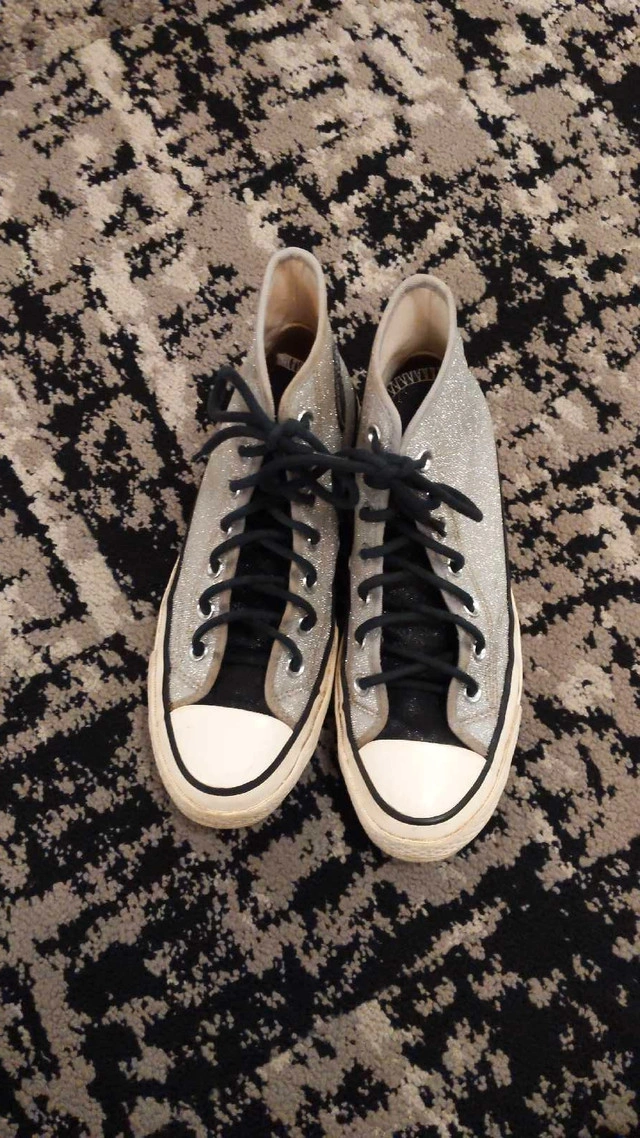 100Slightly worn size 7 woman/5 men Converse high tops with silver sparkles and black laces. Lots of life still in them very good condition!